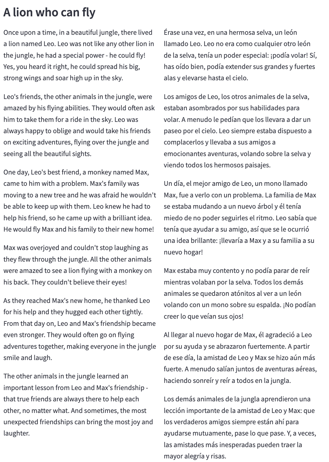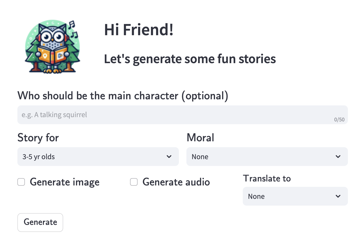 This tool first takes a few details from the user regarding the story, such as the character*, target age range and moral. Then, the story is generated in English and a translated language if requested by the user. This is followed by a human-like audio version of the story, either in English or the translated language if a translation has been requested. Finally, a vivid image of an interesting scene from the story is created and displayed.