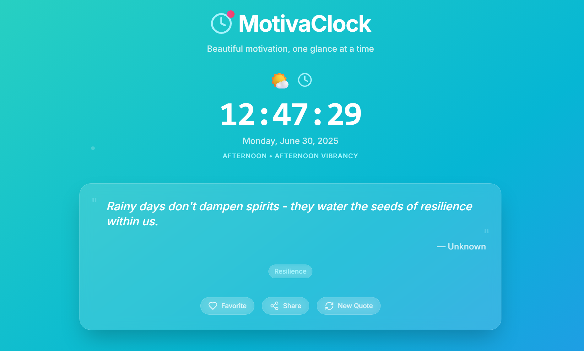 MotivaClock is a minimalist web app that displays the current time alongside inspirational quotes that change based on the time of day. Users can select their current mood, which influences the overall experience, and save their favorite quotes. The app features a beautiful gradient theme that adapts to different times of day (morning, afternoon, evening, night) with smooth animations and a modern glass-morphism design.