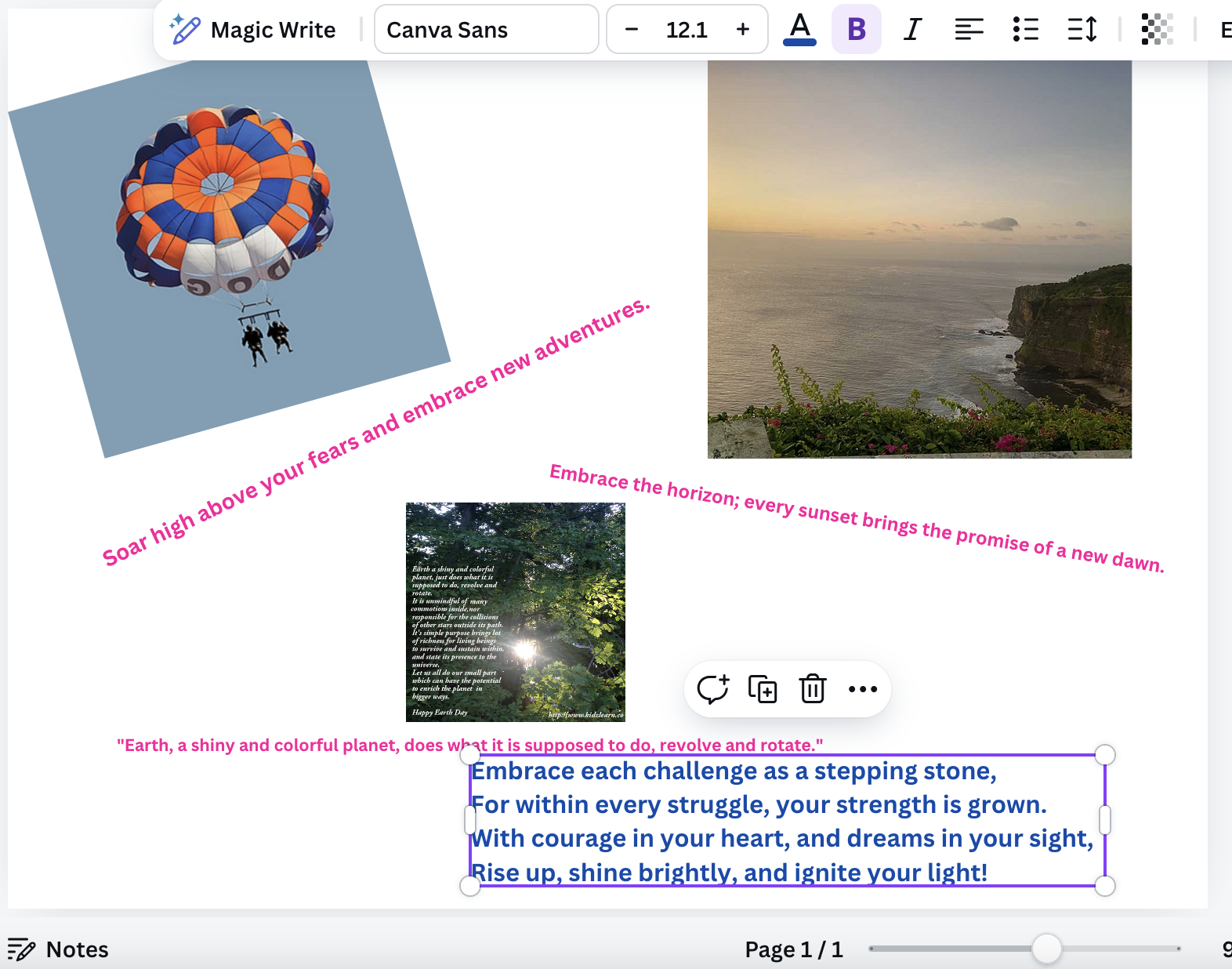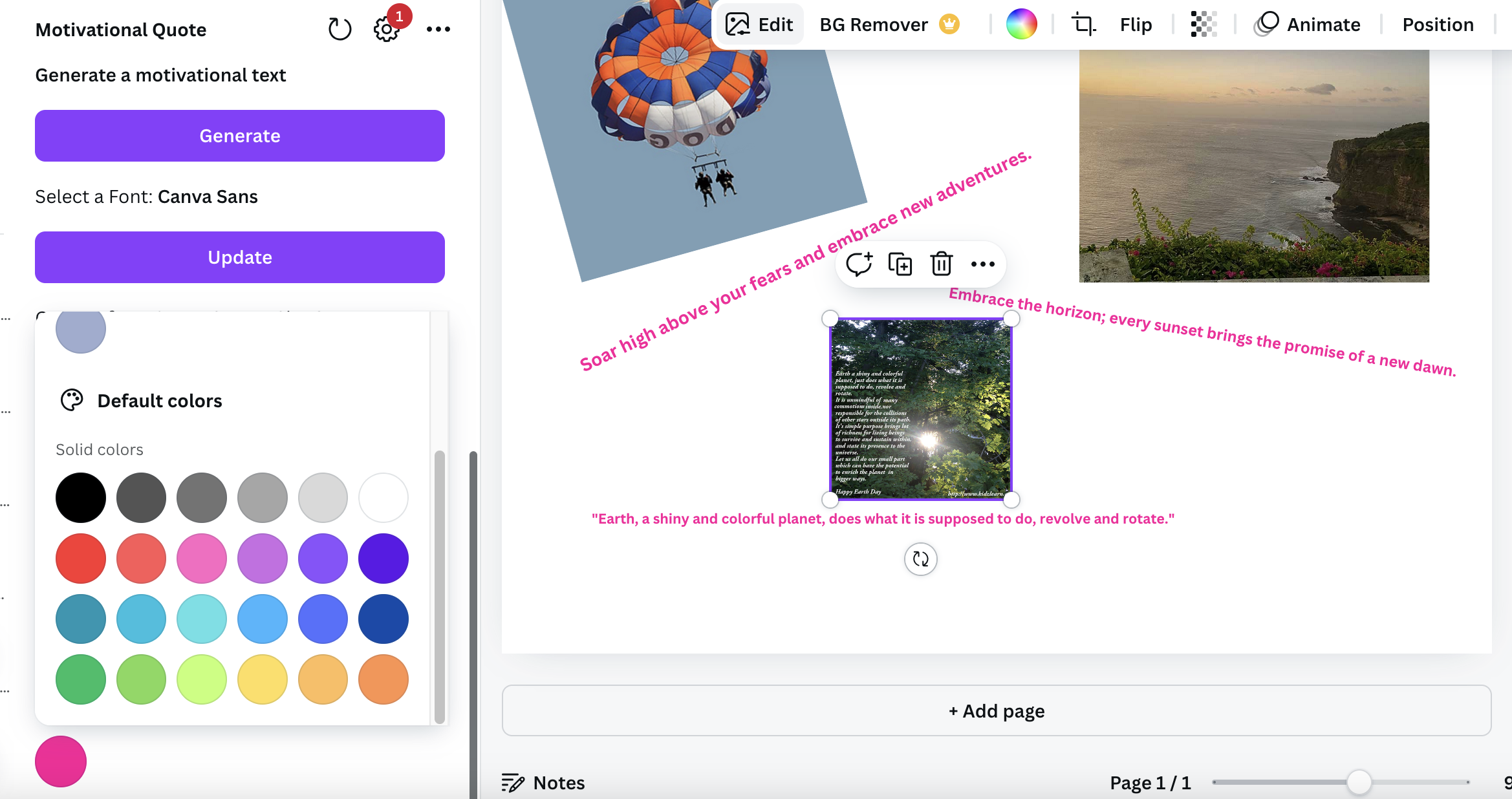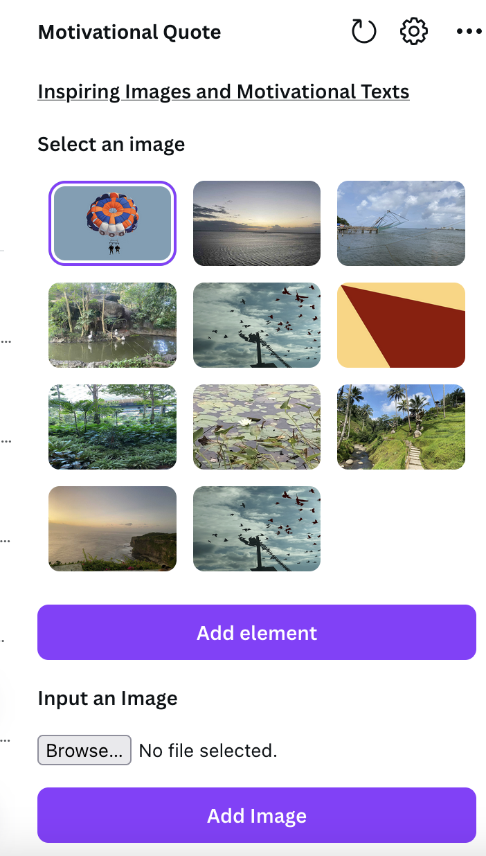 Motivational Quote uses images and text with an option to upload your own image, to make a collage in Canva.com. The user can share or download it and send them later.
