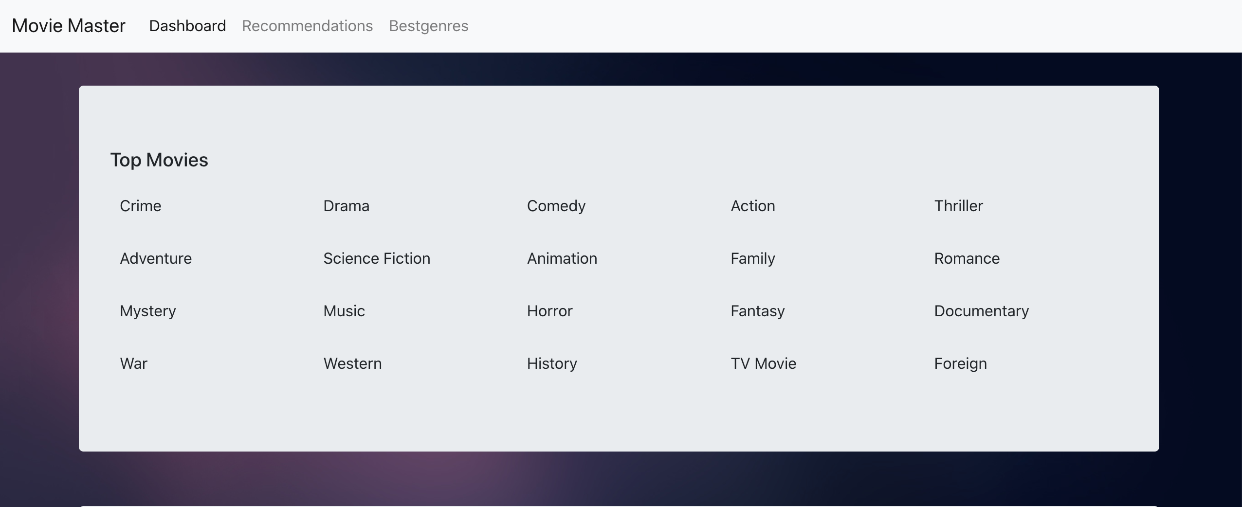 The web application consists of three main pages: a dashboard, recommendations, and best genres. The dashboard lists all the major movie genres that have ever existed, and displays the Top Movies of the genre that is clicked at any given time. The information that is displayed for these top movies includes title, rating, and number of votes. The movie recommendations page takes a movie title as input, and then recommends movies whose genres match all the genres of the specified movie. Finally, the best genres page will display the average genre rating in each genre based on a user-selected decade. This will allow one to take a glimpse into the past in the world of cinema.
