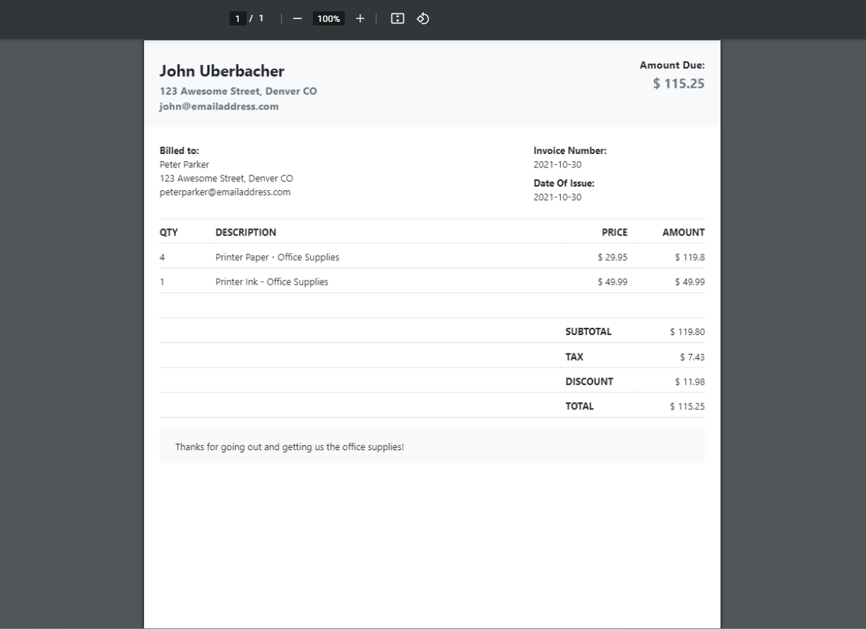 An Invoice creator project built with React. Add itemized items, configure quantity, prices, tax rates and discounts. Download Invoice as PDFs to your device. Uses jspdf-react to capture the data from the modal and covert it from canvas -> pdf.
