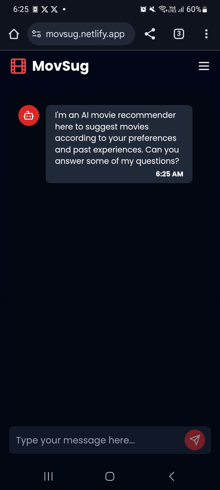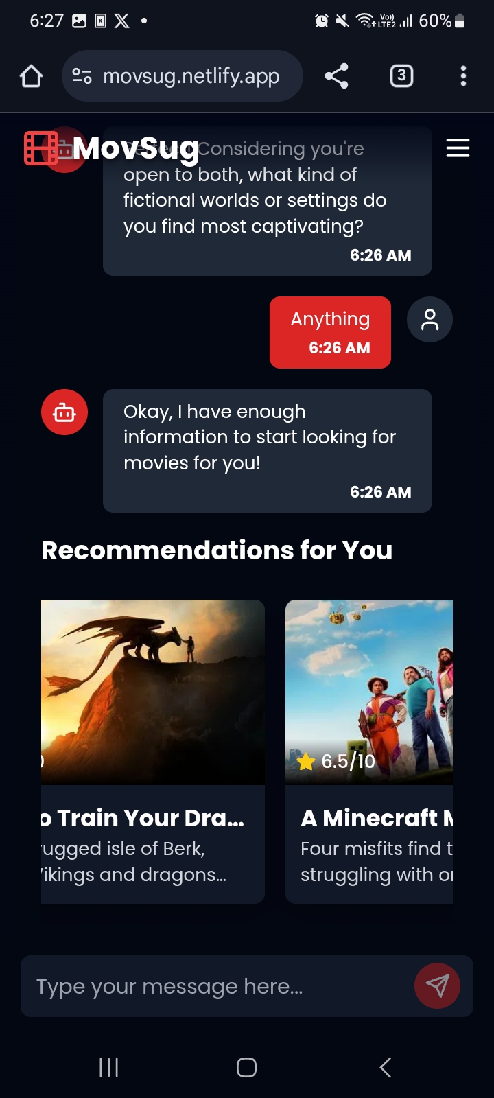 Loading the website on mobile device searching for movies on mobile recomending movies on mobile I took inspiration from ai mental healthcares and other chating ai agent which diagnose your mental health by chatting with you. Its use ai to chat with user then according to chats extract best movies for them to watch the frontend is completely build by bolt.new where backend is in flask (an wsgi rest api lib) extracting appropriate tags to suggest the best movie Built With flaskgeminillmpythonreacttmdbvite Try it out movsug.netlify.app backend.movsug.themanojpanda.xyz
