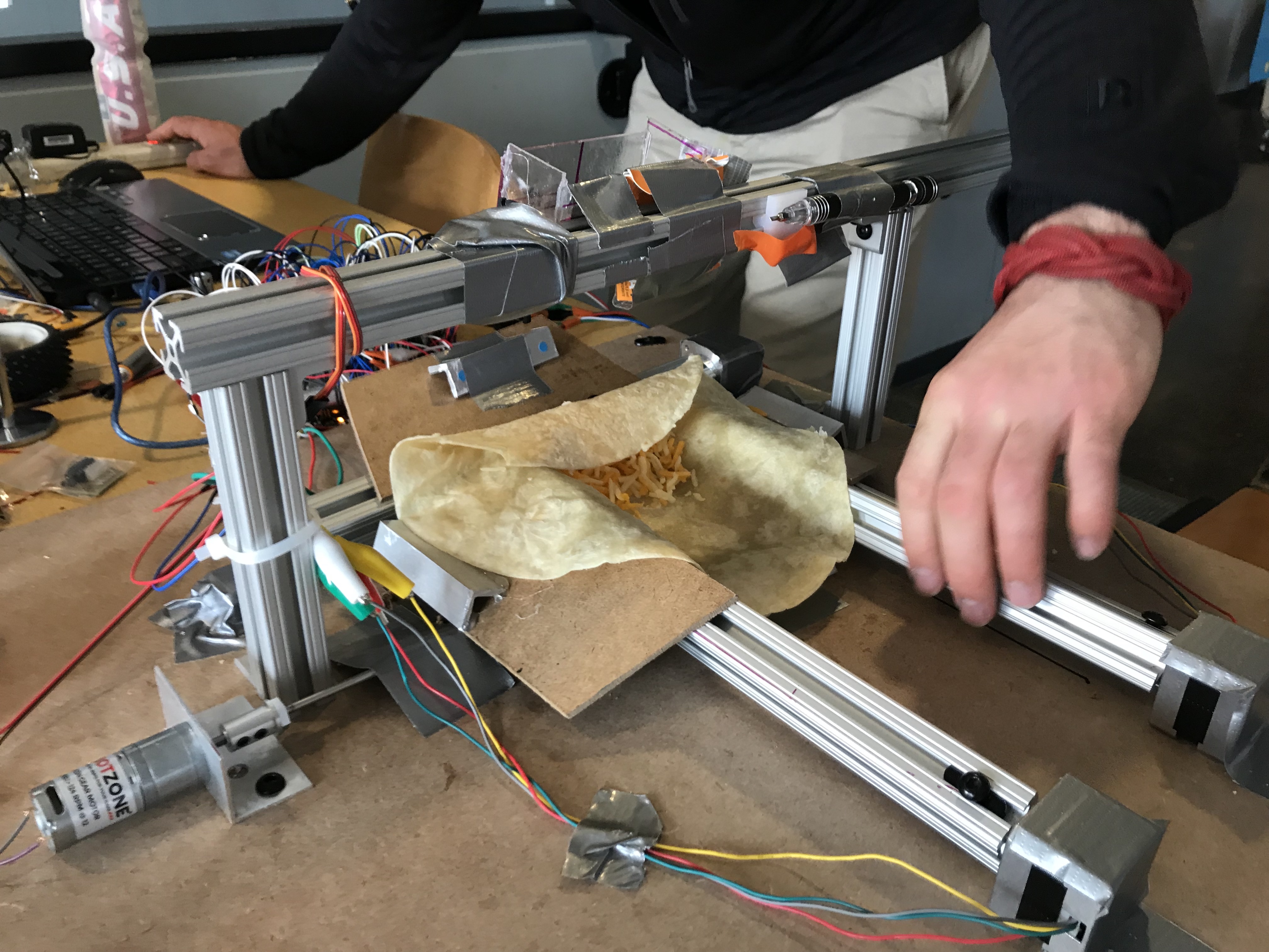 Too many to count. The main problem through the beginning stages of the project was that rolling a burrito without your hands is really, really hard. Once we got the first 3 flips to fold it in half and fold the sides, we tried so many different options for the final roll, moving nets/belts, spinning wheels or rollers, combinations thereof. We settled on a fourth flipper with the burrito crunched up against a block. Interferences left and right. frying electronics. We are using so many actuators (5 motors), that the power supplies didn't have enough power and we had to add in batteries. Food spilling out of the trap door. Trying to use pressure sensors for compliant flippers (they flip until the arduino reads a certain pressure), which took too much time and didn't work as well (rip the takk strips)