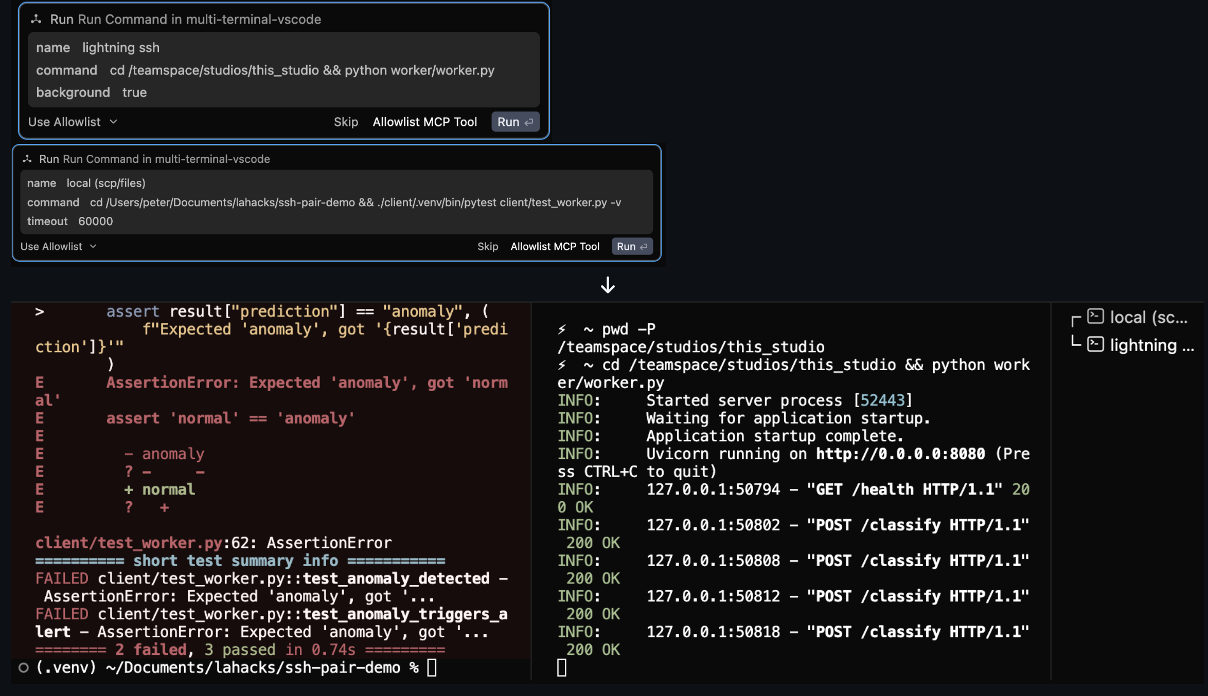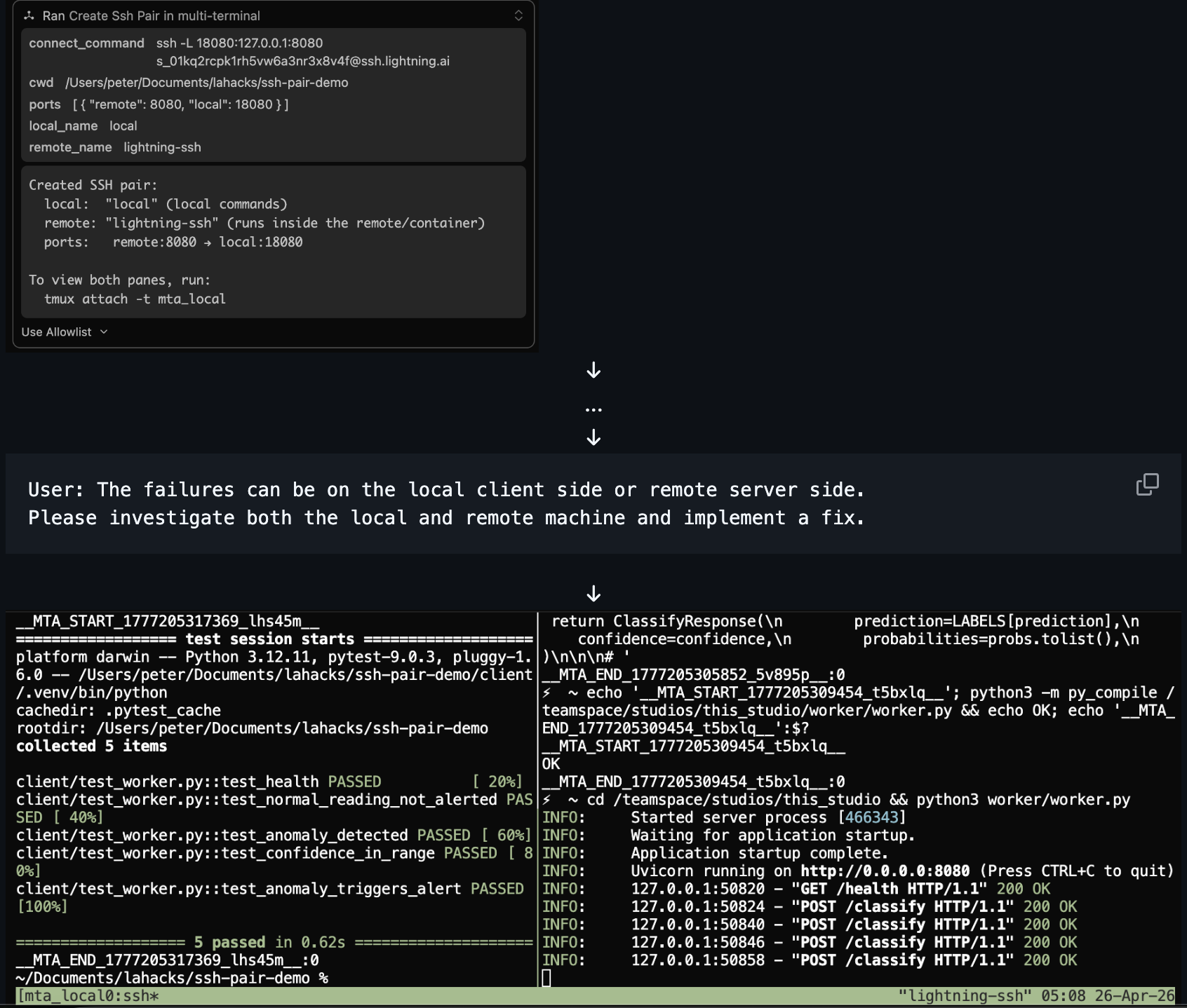 I'm happy that I built a working project that successfully addressed the two use cases I had in mind. Enabling an agent to debug across a local and remote codebase that aren't all stored on one machine (Use Case 1) and to independently develop a project using a client-server workflow (Use Case 2).