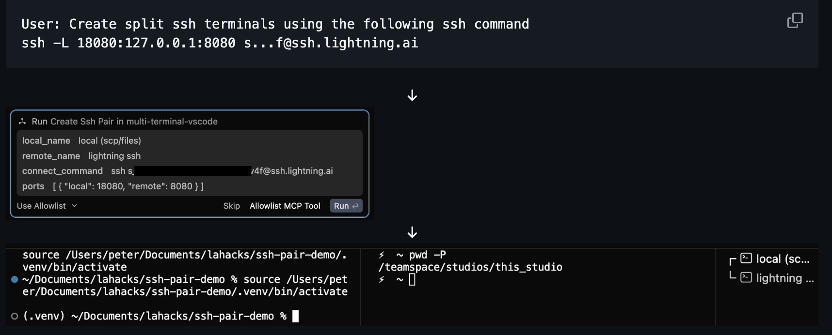 Multi-Terminal Agent integrates with an existing coding agent, enabling it to effectively control two terminals through an MCP Server. The MCP Server exposes tool calls and instructions that enable the coding agent to create multiple processes, execute commands on them, and read the outputs. Effectively, this serves as a context bridge between multiple machines for a single brain (the agent).