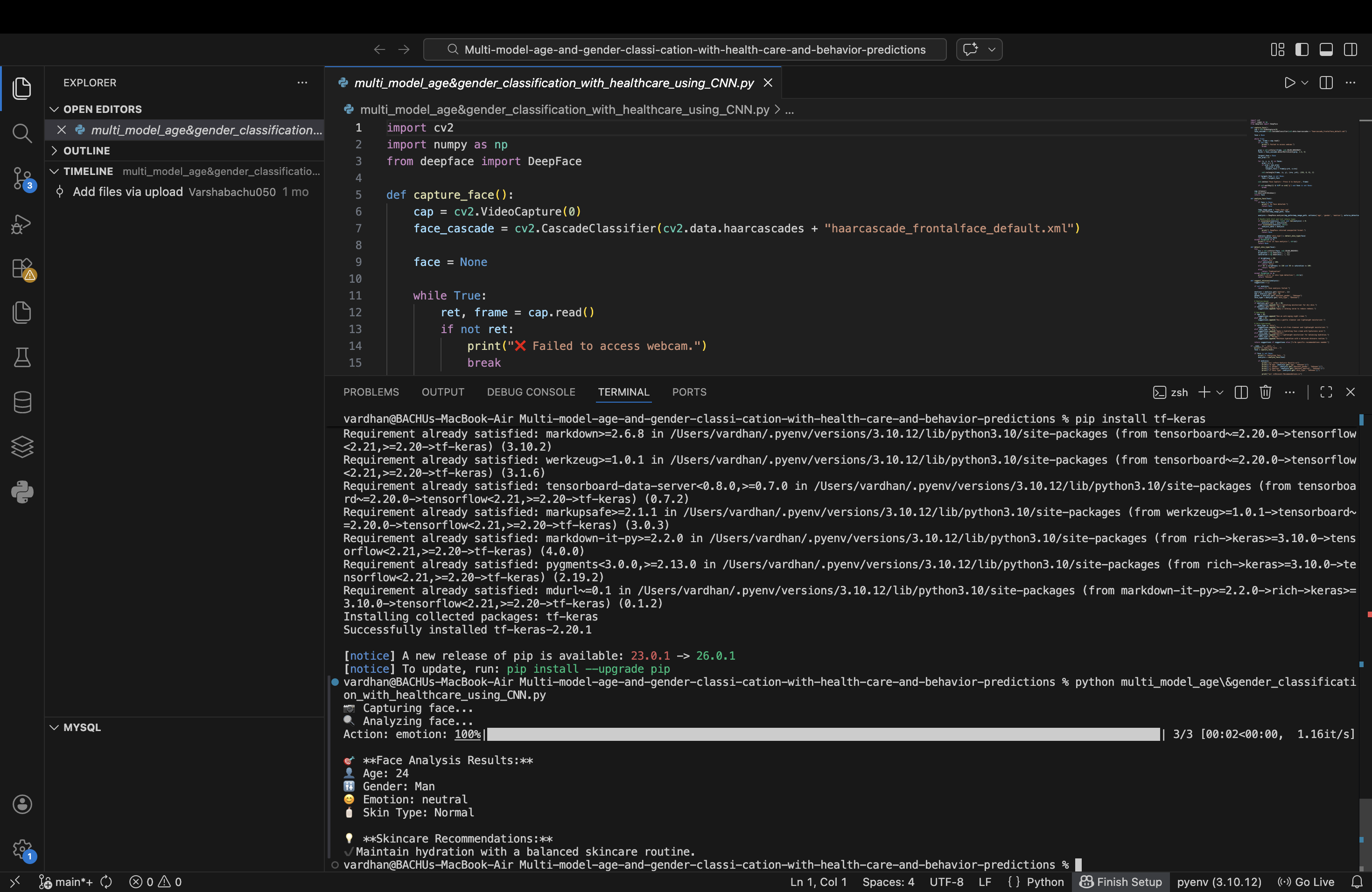 The Multi-Modal Age and Gender Classification with Healthcare and Behavioral Analysis system uses AI and deep learning to detect a person’s face from live webcam or images, and then predicts: