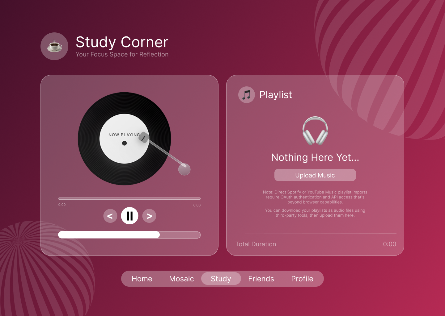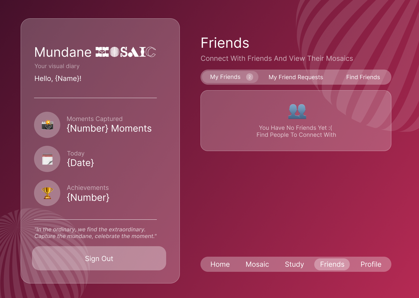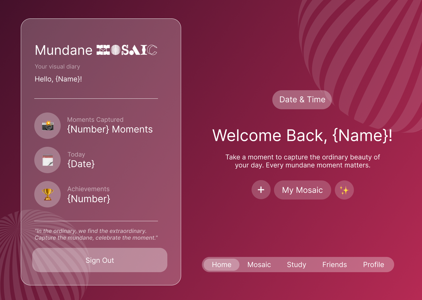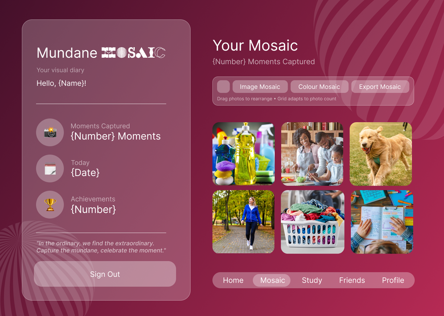Mundane Mosaic lets users upload moments from their daily routines and turns them into clean, aesthetic photo strips that slowly build into a personal visual mosaic. While adding or documenting their tasks, users can also listen to music directly through the platform, turning ordinary chores into a more engaging, uplifting, and reflective ritual.