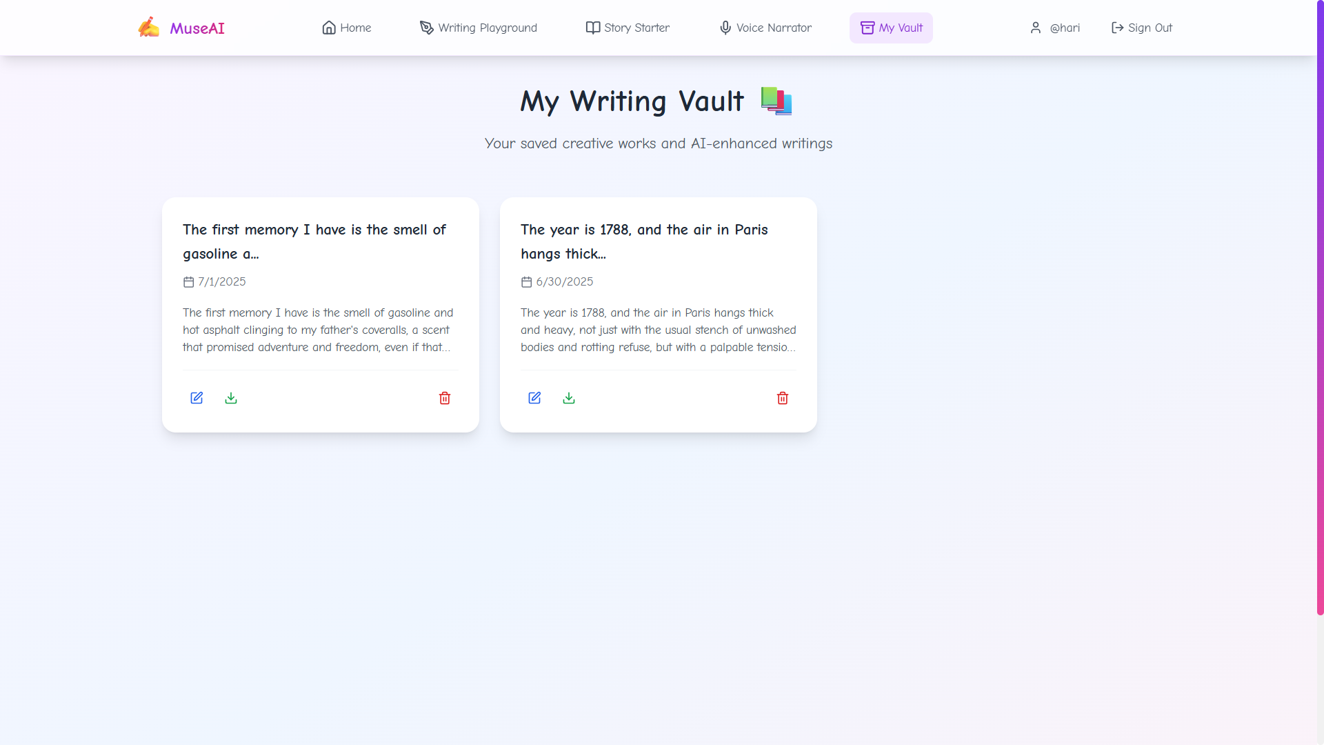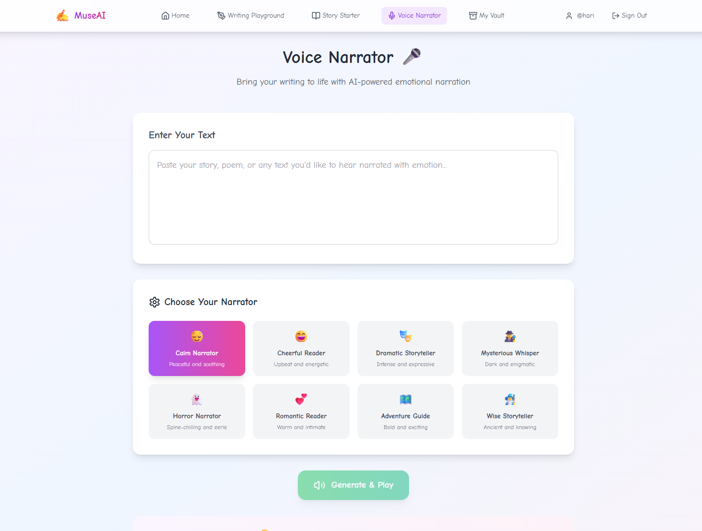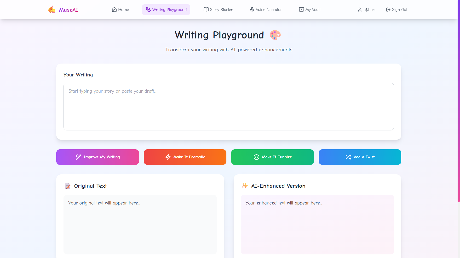 MuseAI was born out of a desire to blend creativity with technology. We imagined an AI companion that helps writers not only get started, but also improve their work, make it dramatic, funny, or even give it a plot twist—and then read it out loud with emotion. 🎤