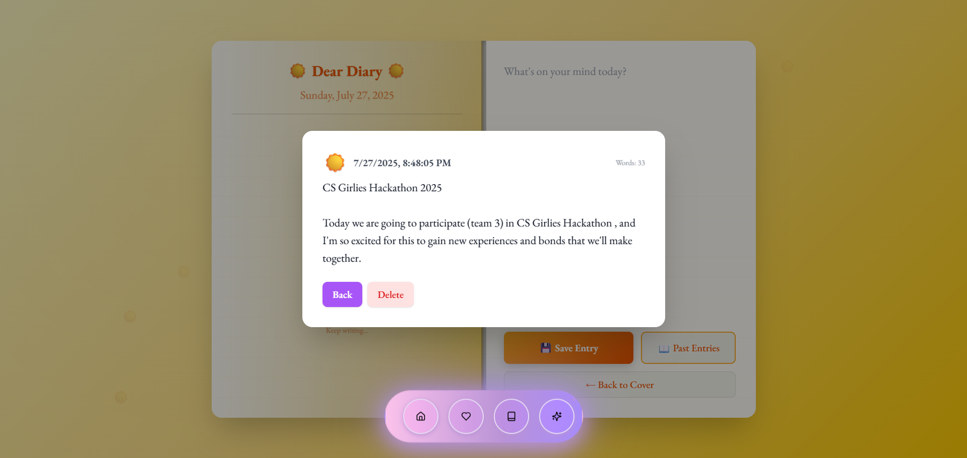 Frontend: React.js with Framer Motion for smooth, page-flipping animations Styling: Tailwind CSS, pastel color palettes, and EB Garamond font for a vintage, feminine aesthetic State Management: Mood-specific entries saved via local storage for quick access AI/Spotify Integration: Initially planned for generating personalized content like poems, moodboards, and playlists — postponed due to time constraints but in active development