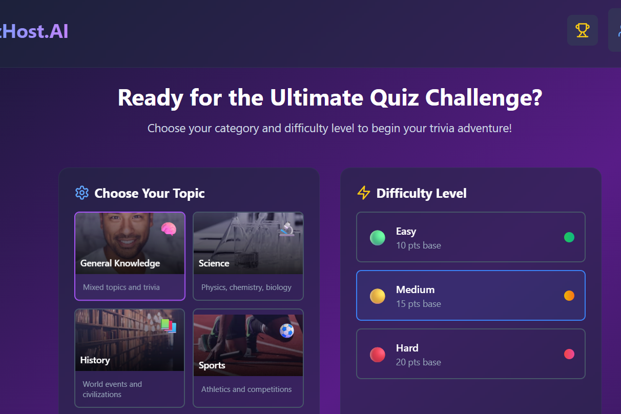 QuizHost.ai: Our Journey We built QuizHost.ai because we were tired of boring, poorly-made quizzes. Teachers and trainers had great knowledge but no time to create engaging assessments. So we thought: why not let AI handle quiz creation while humans focus on teaching? What We Discovered Building this taught us that good quizzes aren't just about right answers - they create moments of discovery. Our first attempts were rough, but user feedback helped us improve constantly. We learned to make AI generate educationally sound questions, not just grammatically correct ones. How We Built It We used Bolt for fast development and easy deployment. The process is simple: users describe what they want, AI creates questions, and we present everything cleanly. We made quiz creation feel like a conversation instead of filling out complicated forms. Main Challenges
