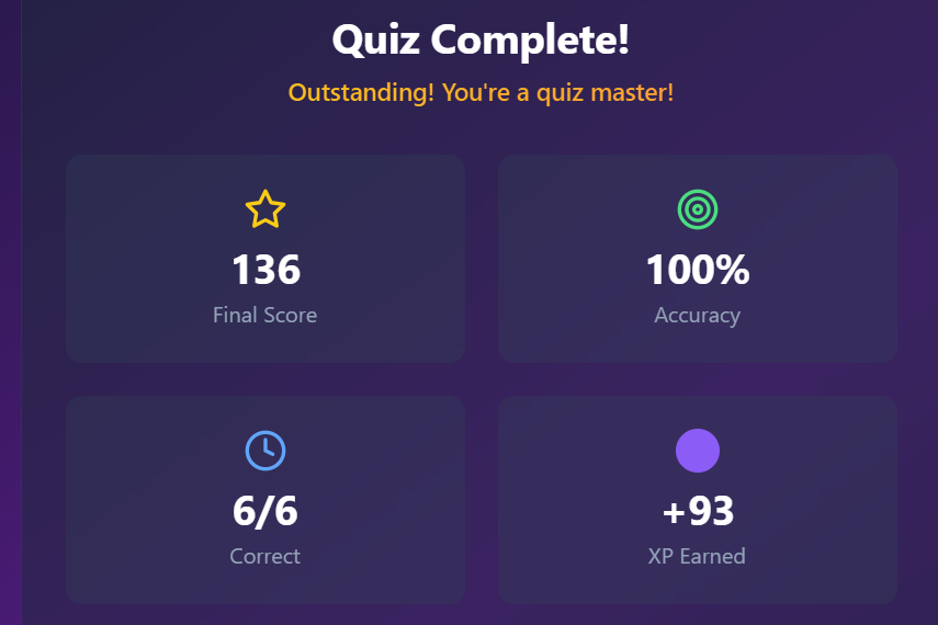 Accuracy: Making sure AI generates factually correct questions required multiple validation systems Balance: Creating something simple for beginners but powerful for professionals took extensive testing Quality: We developed filtering systems so quizzes feel human-crafted, not machine-generated Speed: Users want instant results, but quality takes time - we solved this with smart caching