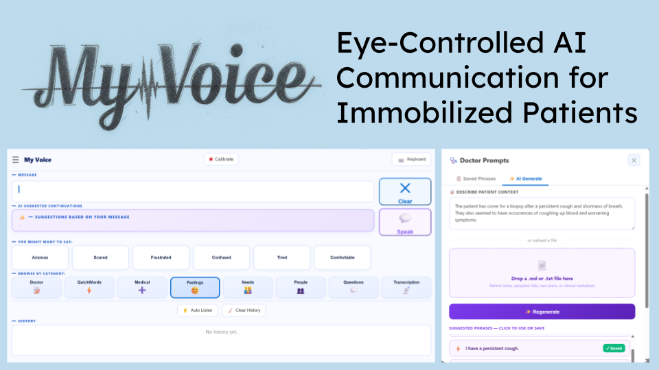 Every year, 800,000 people in the US suffer a stroke. Up to 40% lose their ability to speak, and up to 75% suffer severe motor impairment. They are locked in, having lost traditional forms of communication. However, functional eye movement remains highly preserved in the vast majority of patients. This is My Voice: a zero-friction, augmented and alternative communication (AAC) dashboard and eye-tracking software that uses the one reliable motor function patients have left to give them their voices back.