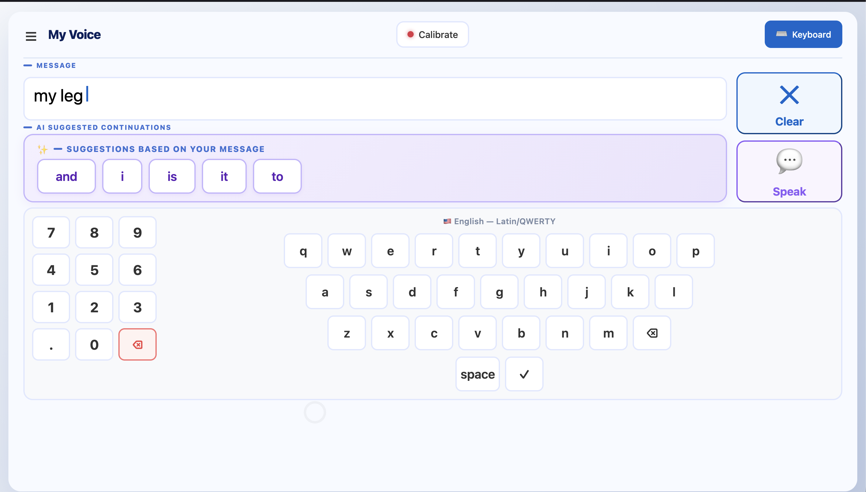 My Voice is a webcam-based Augmented Accessible Communication(AAC) platform that empowers users to control their computer and communicate entirely through their gaze. By mapping the user's eye movements to an on-screen cursor, individuals can navigate an anticipatory user interface to construct sentences.