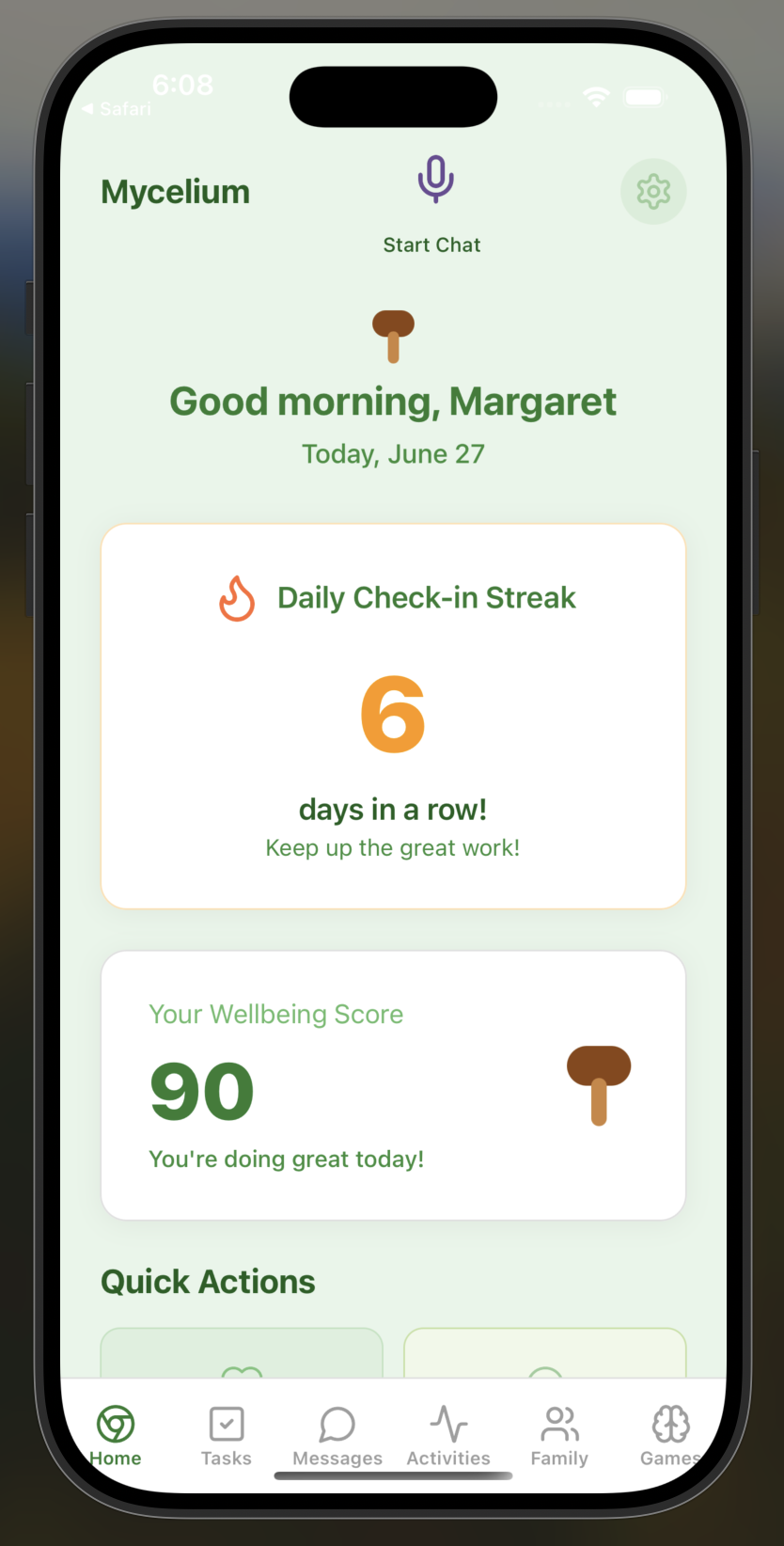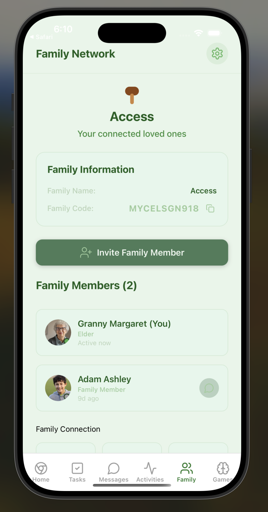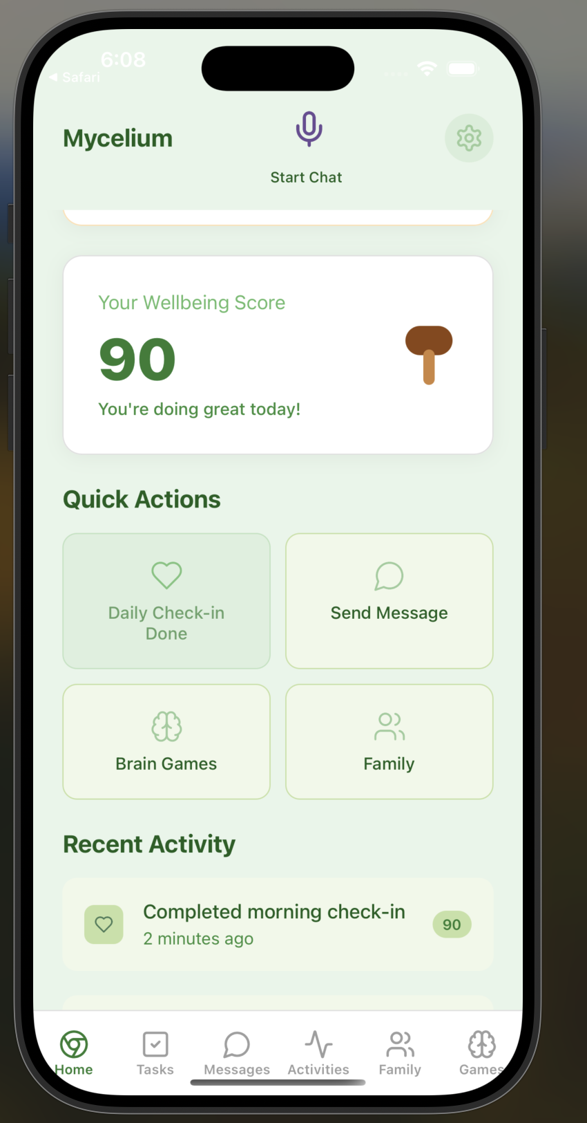 Mycelium helps families care for their elderly loved ones by providing daily check-in questions, gentle reminders with photos or videos, and wellness tracking. There are two roles in the app: elderly and family member users. Elderly users can easily check in (and show that they are safe), view their tasks, and play brain games, while family members can monitor their well-being through analytics dashboards, set up custom reminders and check-ins, and communicate directly through the app.