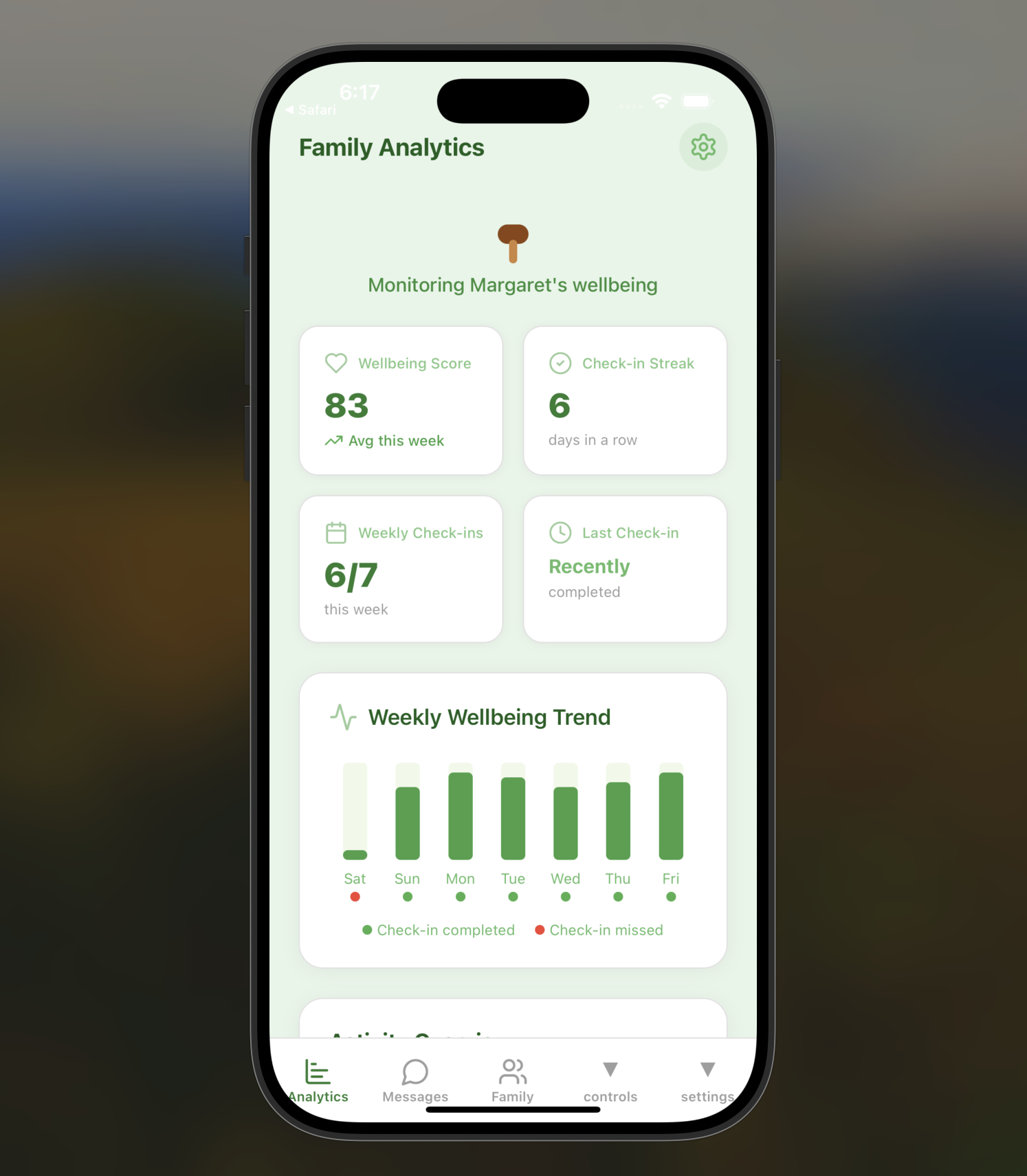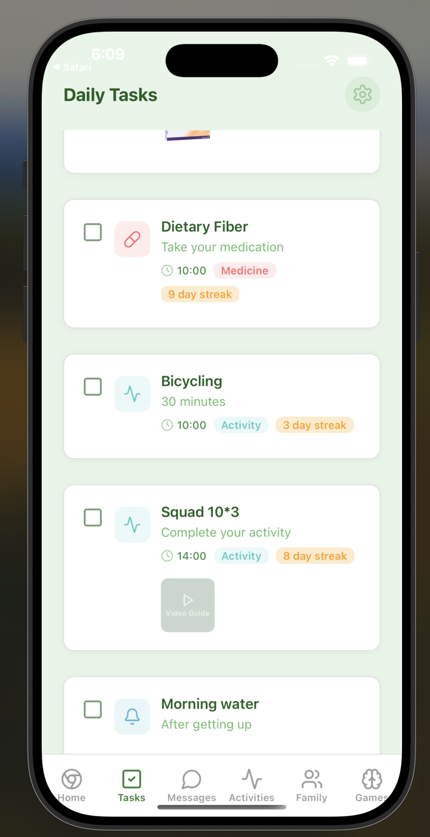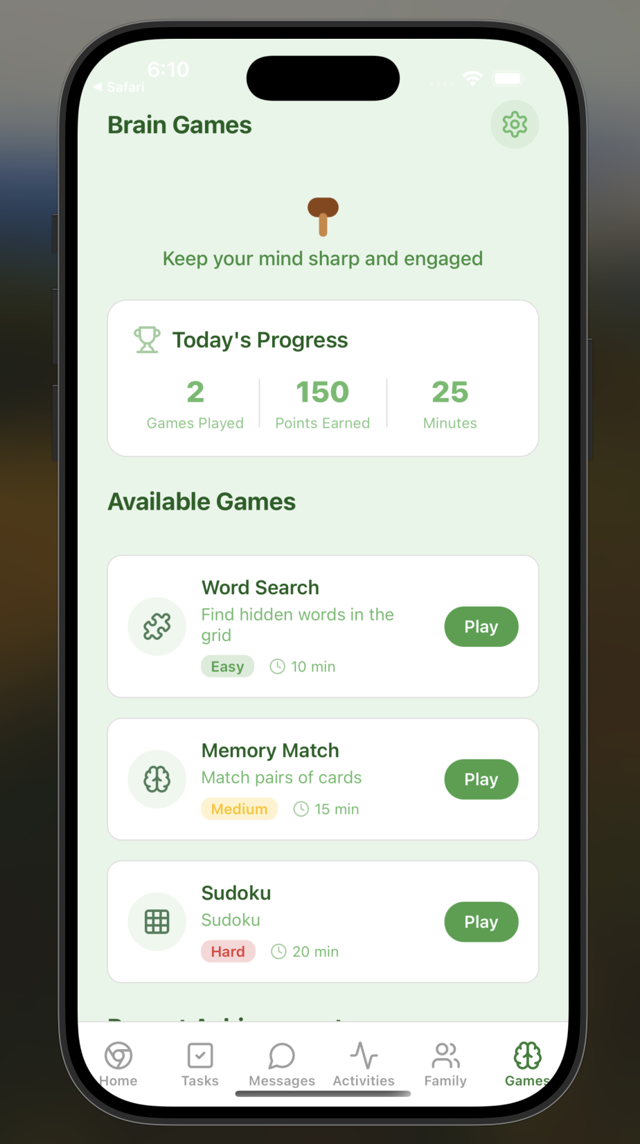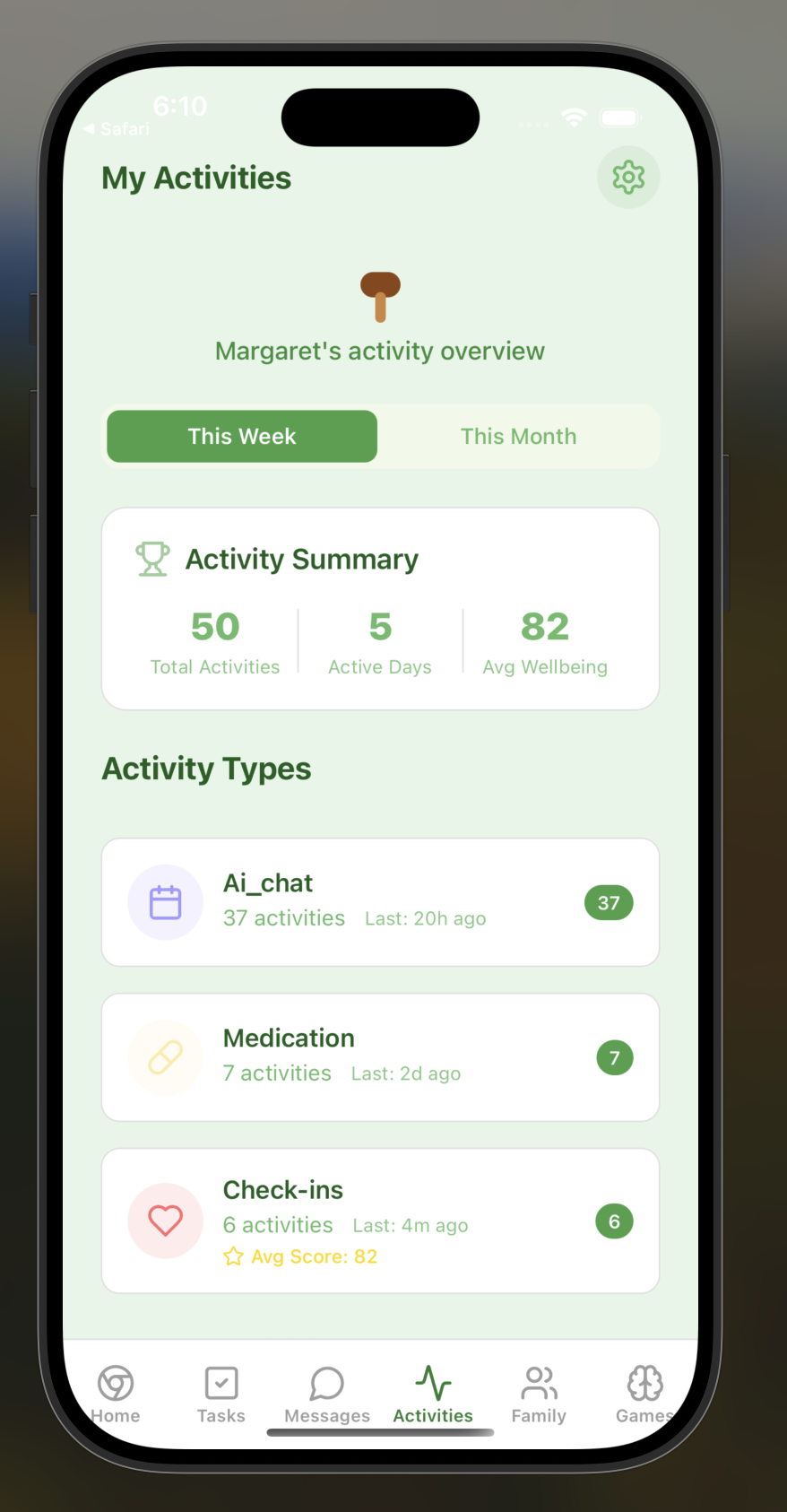 Mycelium helps families care for their elderly loved ones by providing daily check-in questions, gentle reminders with photos or videos, and wellness tracking. There are two roles in the app: elderly and family member users. Elderly users can easily check in (and show that they are safe), view their tasks, and play brain games, while family members can monitor their well-being through analytics dashboards, set up custom reminders and check-ins, and communicate directly through the app.