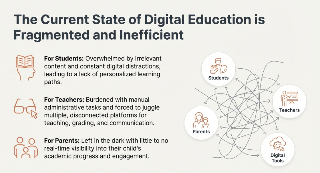 First, we saw teachers drowning in paperwork. Amazing educators were staying up late to write quizzes, track grades, and manage online classes. They wanted to inspire students, but they were stuck doing admin work.