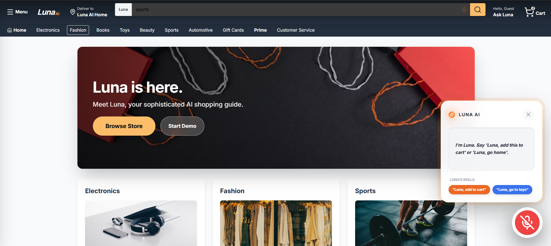 MyLuna is an AI-powered shopping application that delivers a fully voice-controlled experience. The platform includes multiple categories such as Toys, Fashion, Electronics, Books, Sports, Prime Deals, and Customer Support.