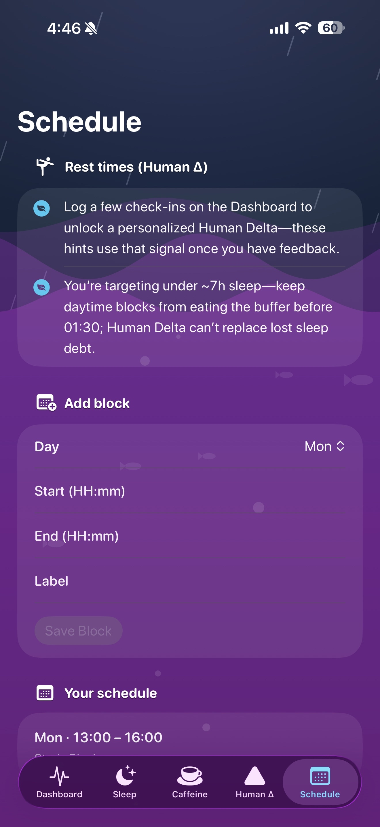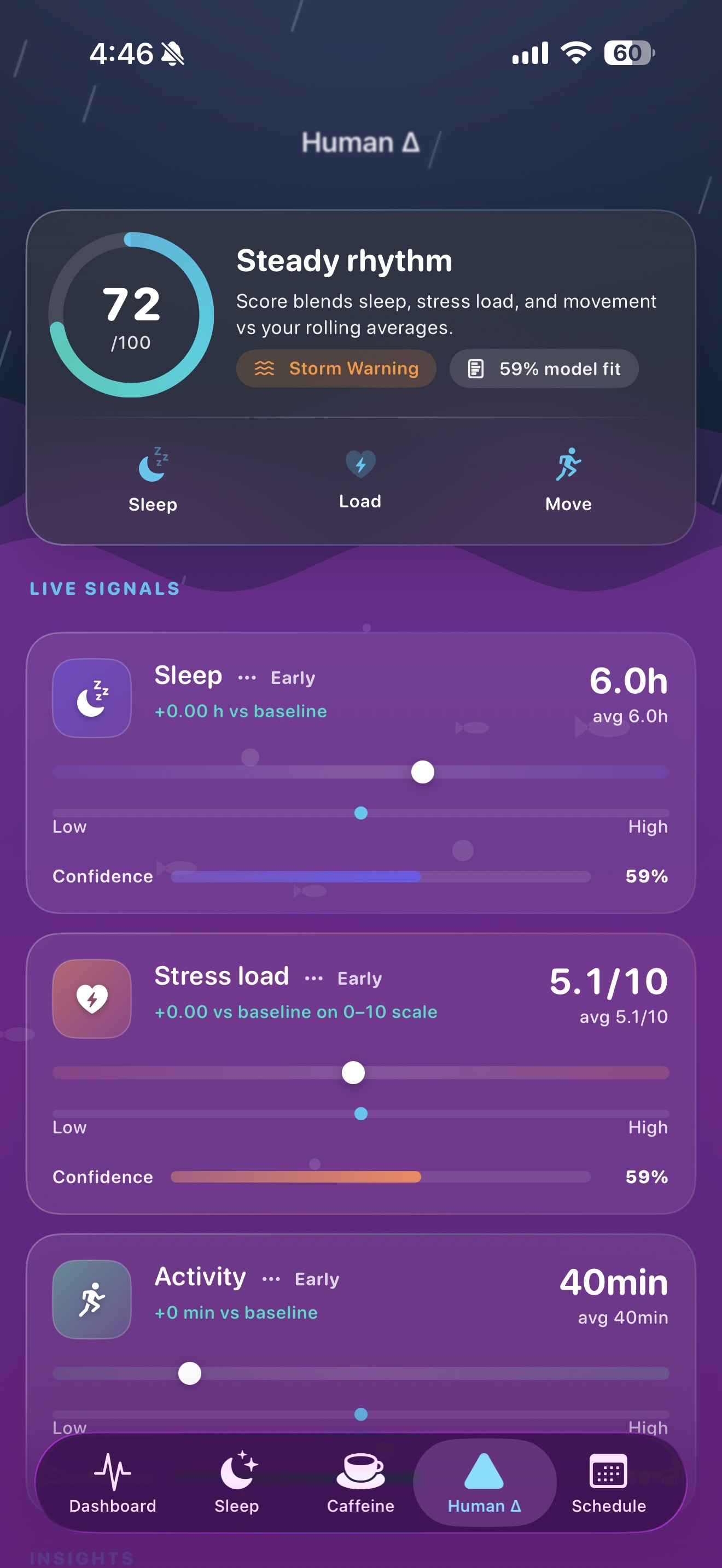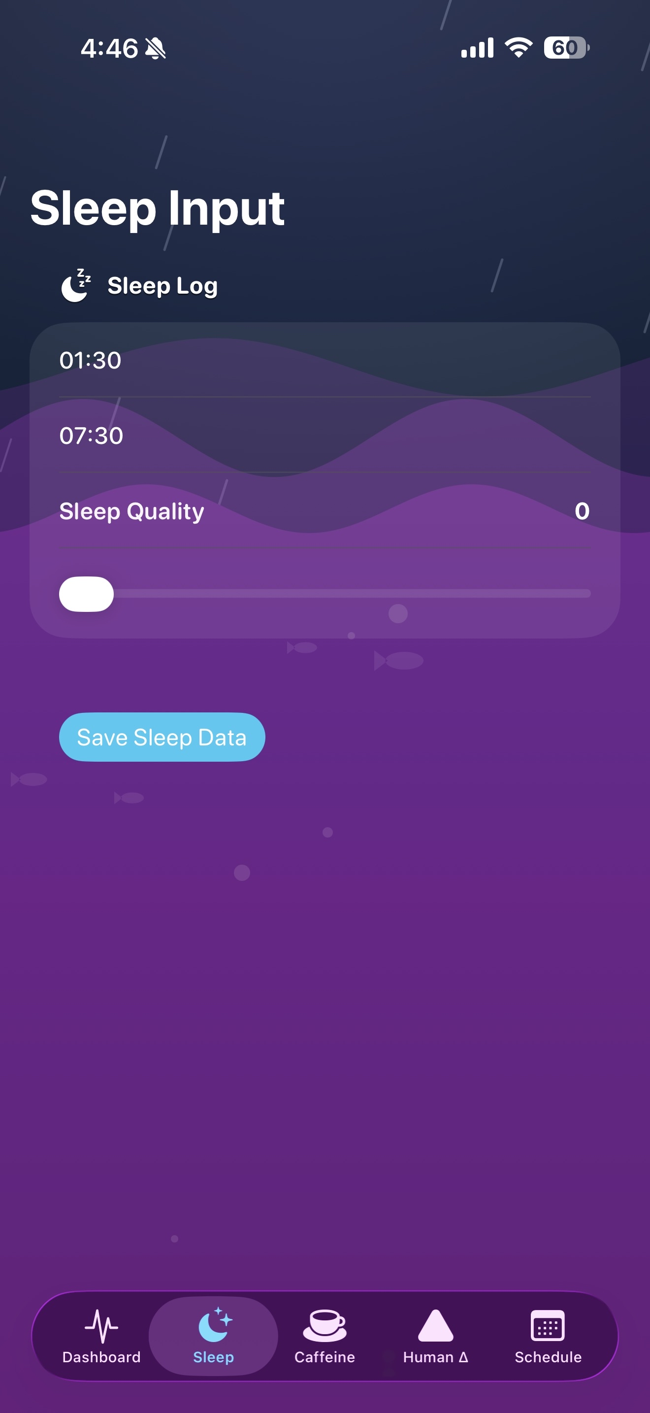 We programmed with AI as a guide to streamline our development process. To begin we found three data sets, 'Student Sleep Patterns', 'Sleep Health and Lifestyle Dataset', 'FitBit Fitness Tracker Data' off Kaggle. We filtered the columns we wanted, and feature engineered new columns that seemed relevant. We trained a Random Forest Machine Learning Model, to predict the user's health score. Using this score, we attached Human Delta to mimic the feature engineering, to do further analysis on the health score and users personalized input values. UI in Swift with SwiftUI—screens, tabs, scrolling stuff, sheets, and the glassy ocean-themed cards are all pretty standard SwiftUI, with shared colors and styles in AppTheme and the oceanCard look. The energy graph uses Apple’s Charts framework. The dashboard’s feedback slider is a tiny bit of UIKit (UISlider through UIViewRepresentable) because SwiftUI’s slider was fighting the scroll view. Combine handles things like timers and refresh loops feeding LocalStore, and Foundation covers models and API plumbing—it’s a straight-up native iOS app, no web UI stack.
