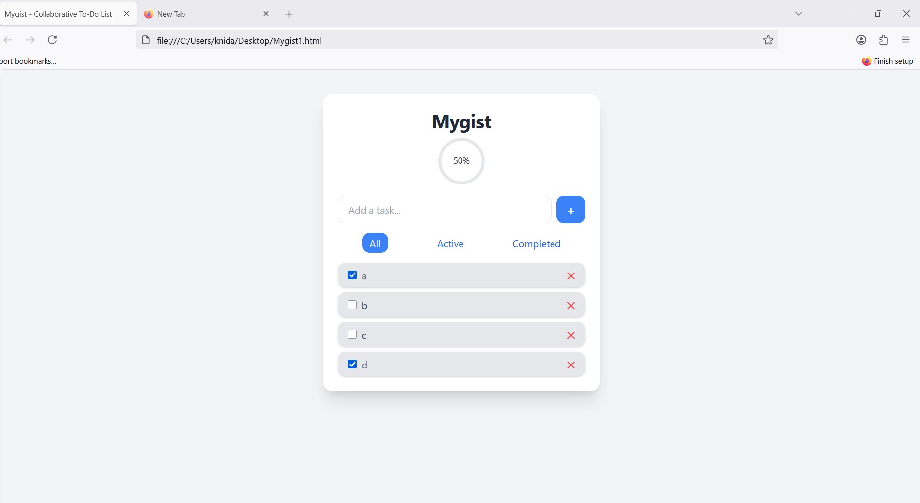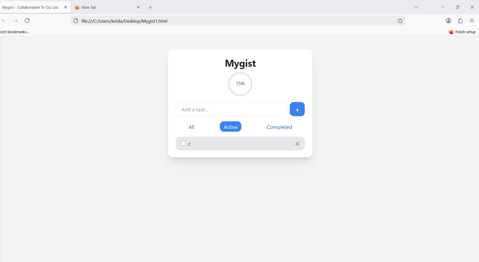 Lets you add, edit, delete, and reorder tasks Saves data in localStorage (stays even after refresh) Shows a circular progress bar for completion tracking Filters tasks by All, Active, or Completed Adds smooth animations and sound effects for interaction