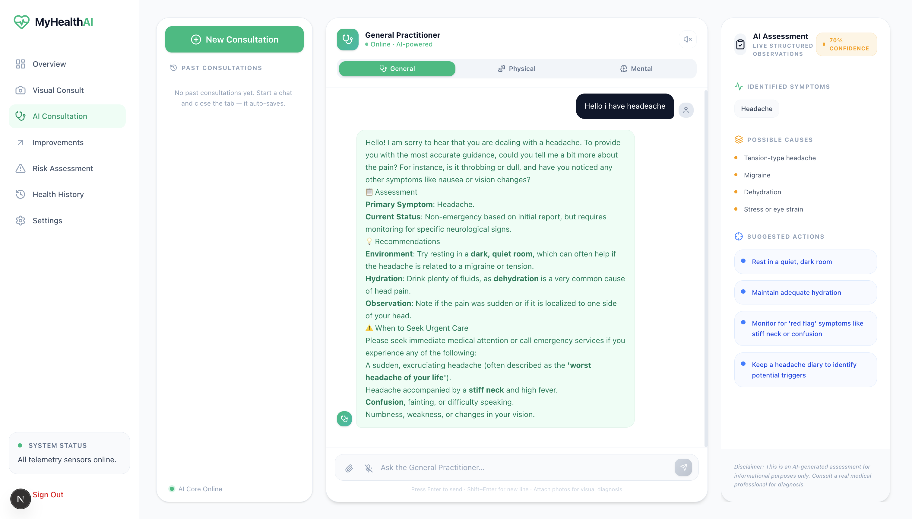 - Dossier Generation: At the end of a session, a professional PDF Medical Dossier is generated for the user to share with their physical doctor.