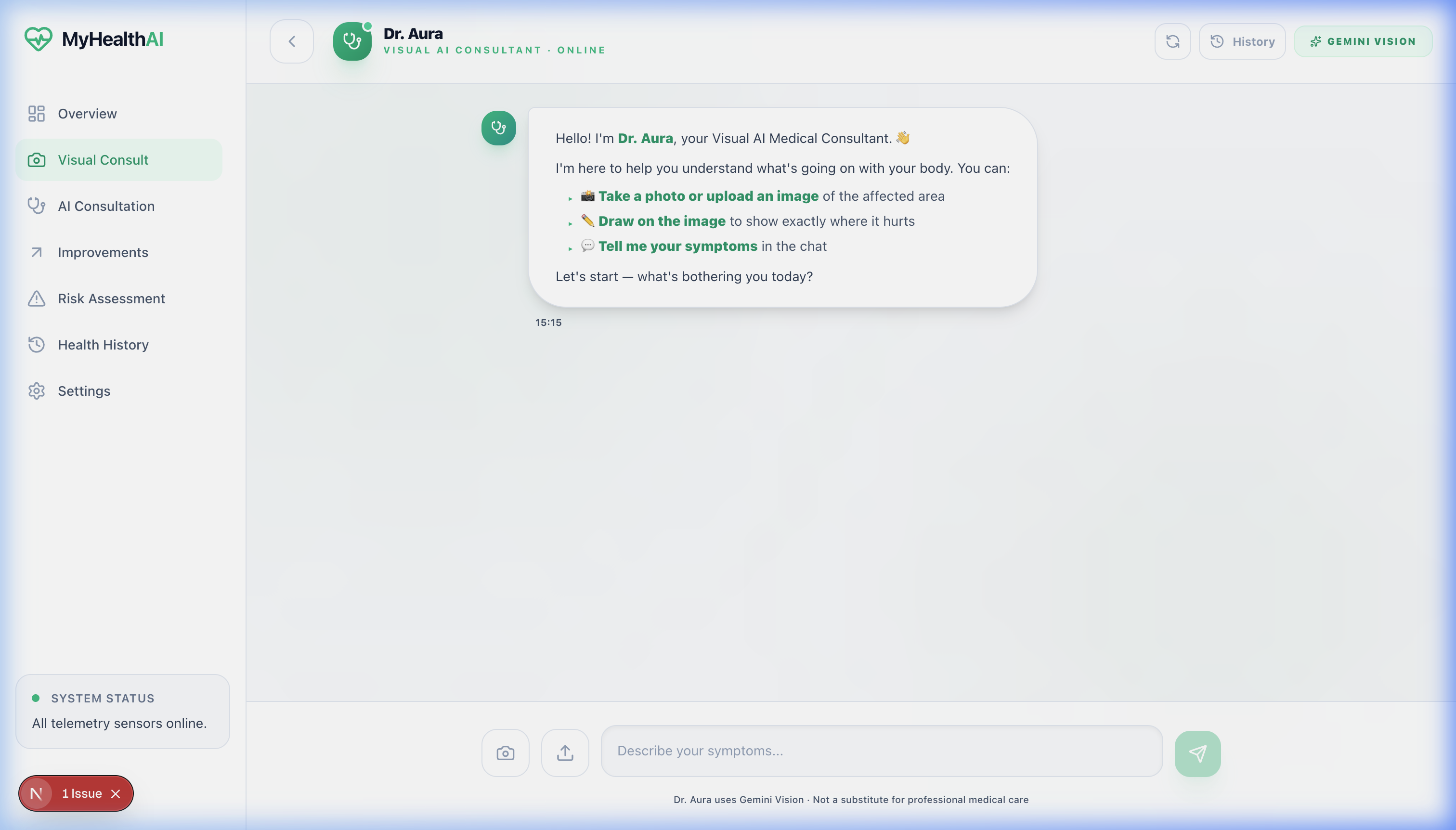 - Multimodal Intelligence: Using Gemini 2.0 Flash, our agent (Dr. Aura) doesn't just read your vitals; she can see symptoms via camera analysis, hear your cough or vocal concerns, and speak with human-like empathy.
