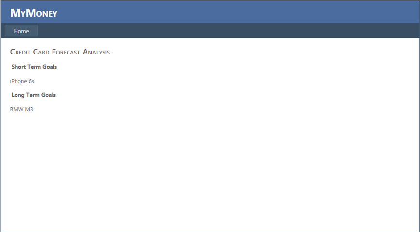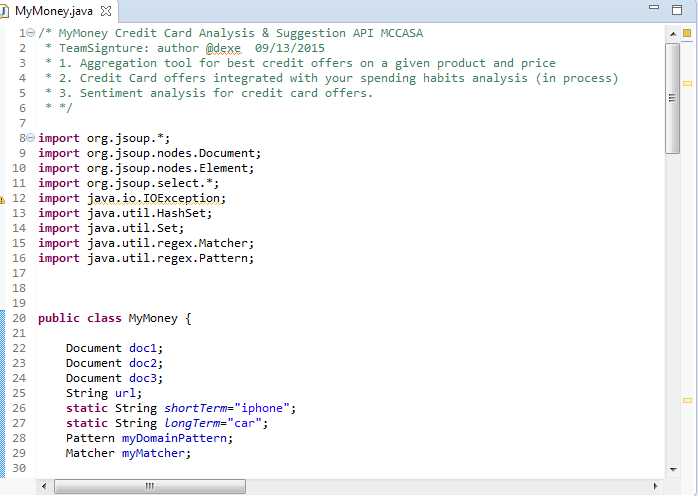 Welcome to MyMoney. Its analysis for you is comprehensive. Second feature of our project is to do best credit card forecast for the user to achieve his short and long term post. Assume the scenario- you want to buy an iphone in next 3 months say november 2015 (short term goal). We help you achieve this smoothly by telling you which credit/debit card will help you get this iphone with maximum savings and easeness. We use the foll to forecast the best credit card: 1) Credit card offers rolled out by the companies of which you hold the cards, during the period of november-december for the last 3 years on iphone(since iphone launch in september is a regular event). Next criteria is to use your spending habits, assign a threshold, analyze which credit card will be best with your spending habits so that it will help you get that iphone with ease. Third criteria -Sentiment analysis of credit analyst articles to score the credit cards performance that will help you achieve short and long term goals. Third feature of the project is contribution of an API in Java to aggregate credit card offers from different companies in accordance with your short and long term goals.