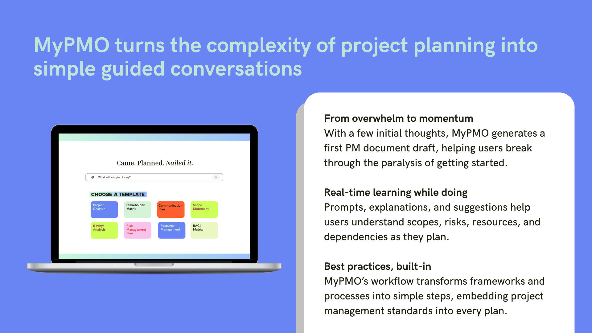 MyPMO aims to democratise these frameworks and reimagine the project management process by embedding templates with AI-guided tailoring and conversational workflows. By removing friction and actively teaching users as they plan their project, non-experts gain access to PM best practices without the high barriers of rigorous PM training or tool exercise.