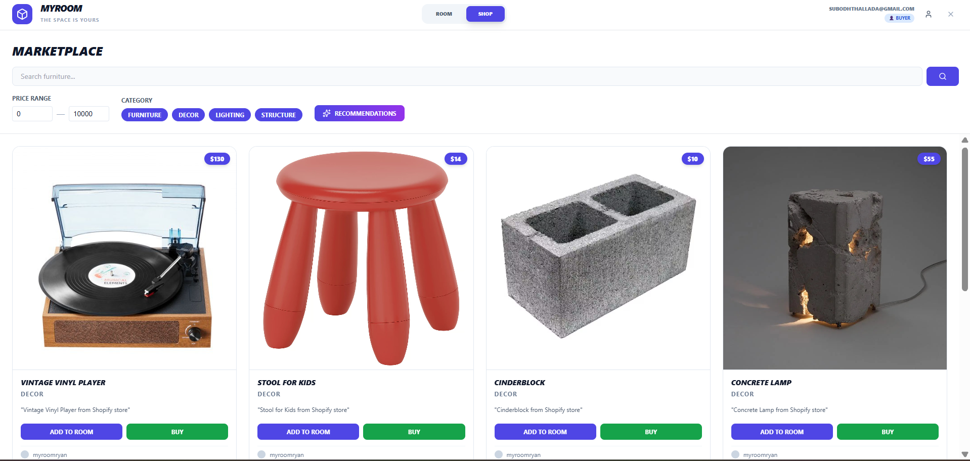Shopify Integration: Every item in your virtual room is linked to a real-world marketplace or peer-to-peer second hand market. You can swap furniture, test layouts, and purchase items directly through our marketplace.