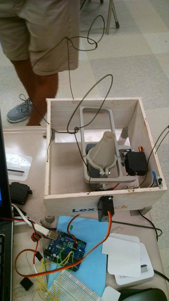 We used a 3D printer to create most of the hardware in the game. The models we used were all created during the hackathon using SOLIDWORKS. We also used balsa wood for simple surfaces like the box that the game is housed in. The fan is rotated by two servos, each on a horizontal axis perpendicular to the other. Using a dual gimbal system, we can rotate the fan to point in any direction.