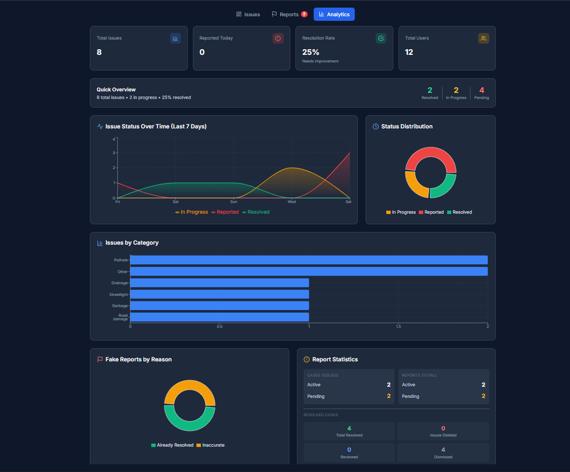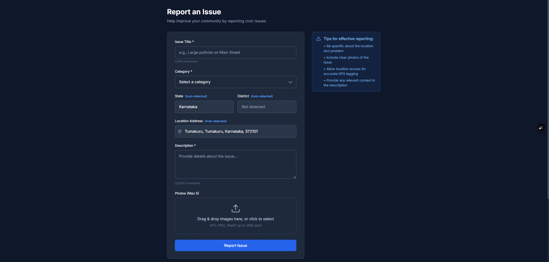 Citizens can report civic issues such as potholes, garbage overflow, water leakage, and streetlight failures using images and location data.