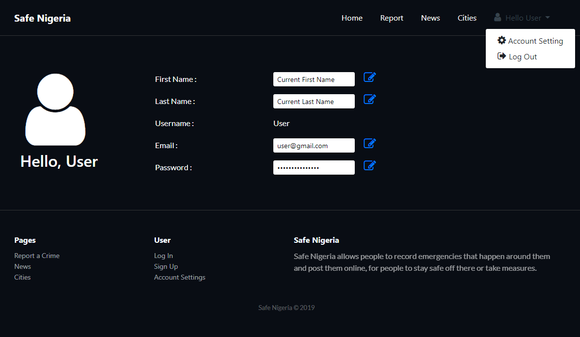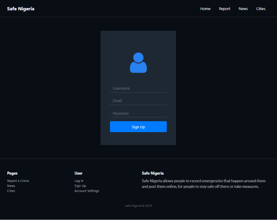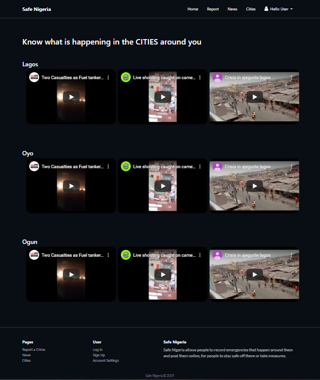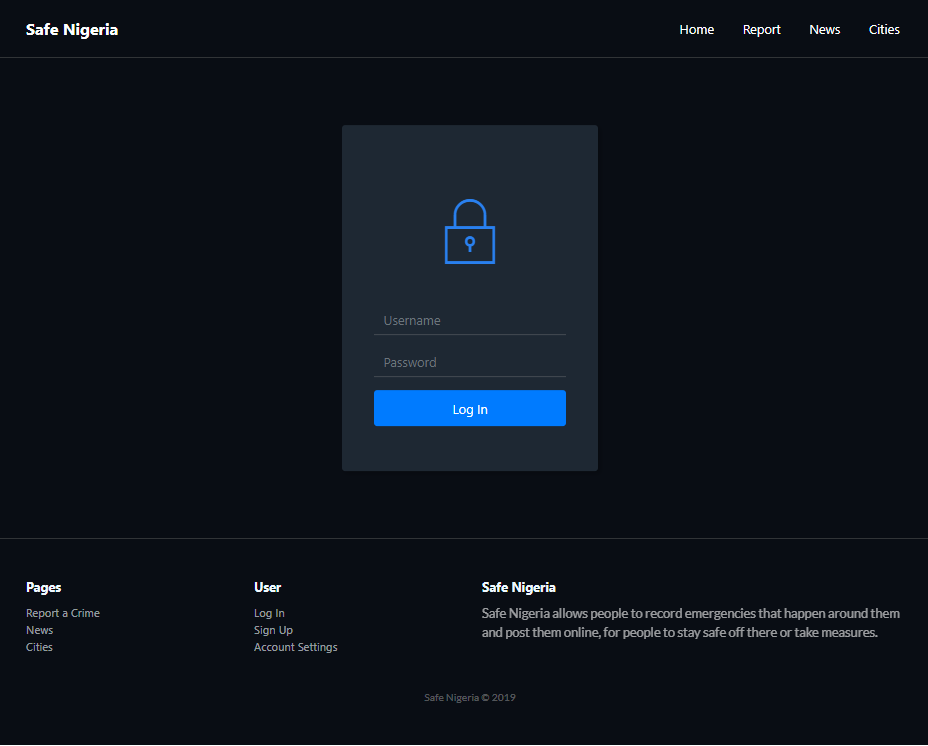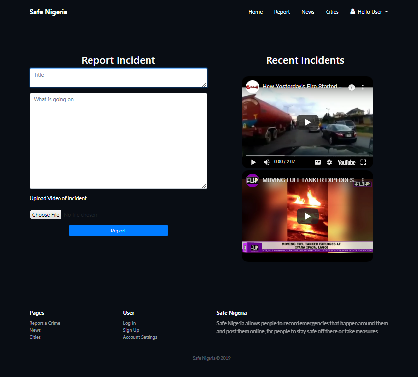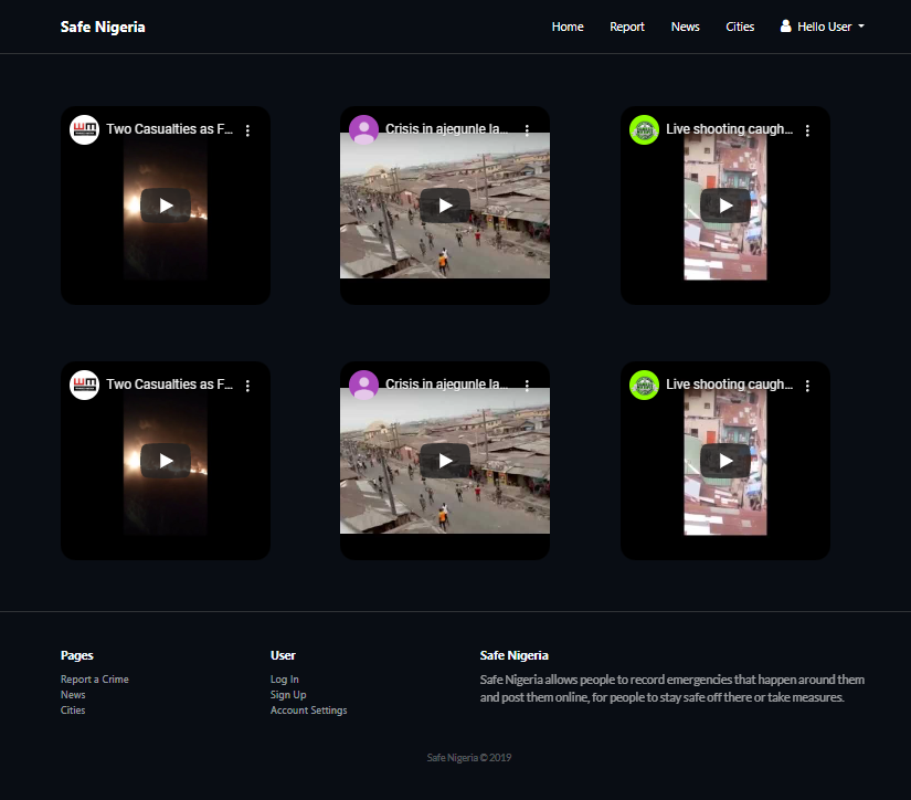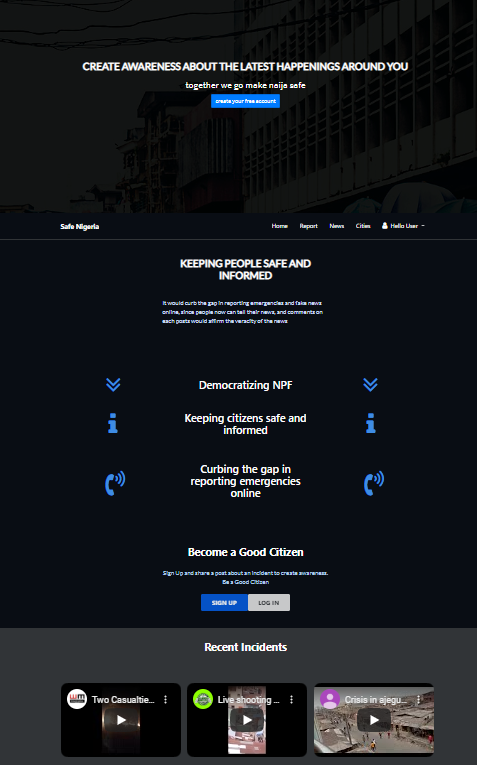After NaijaHacks2019, We are going to complete the development of SafeNigeria, carry out user testing then launch for Nigerians to use and stay safe. We are also adding a GPS feature that informs users on what is happening at 200m radius around them, so they can take safety precautions and alert their love ones too. We believe Nigerians are the ones that can make Nigeria and Nigerians safe