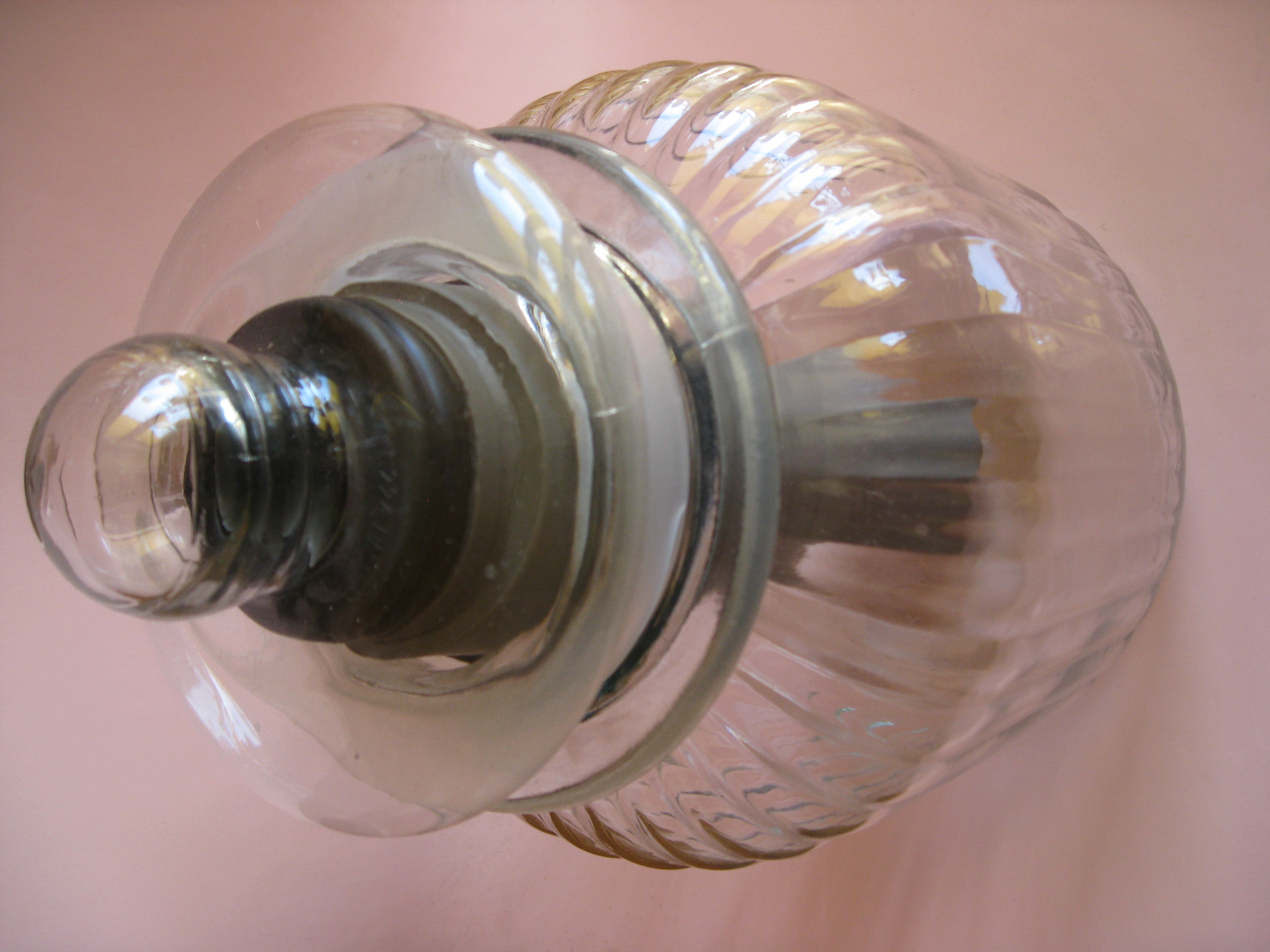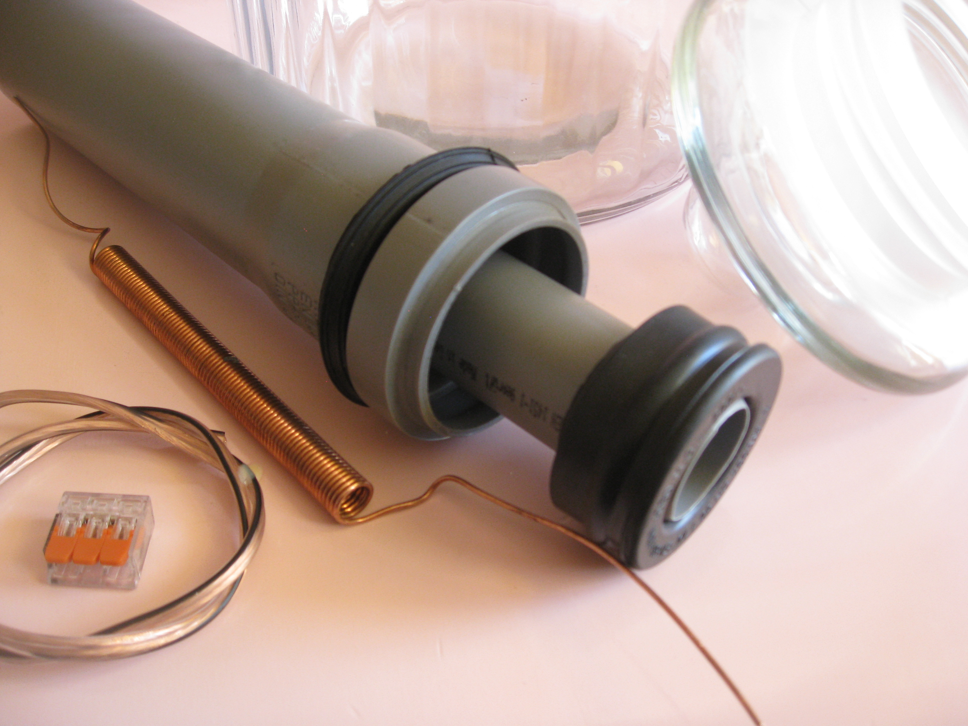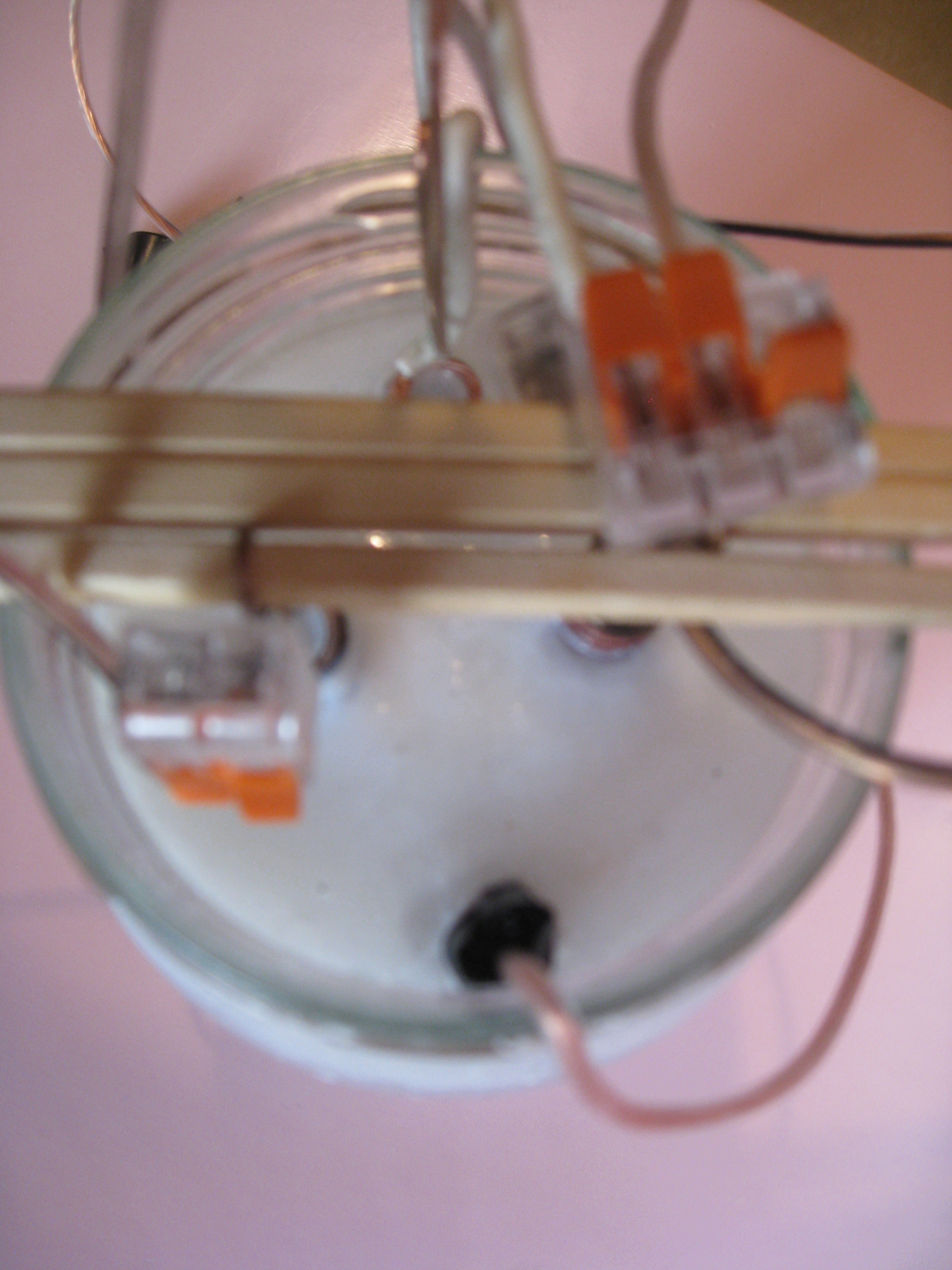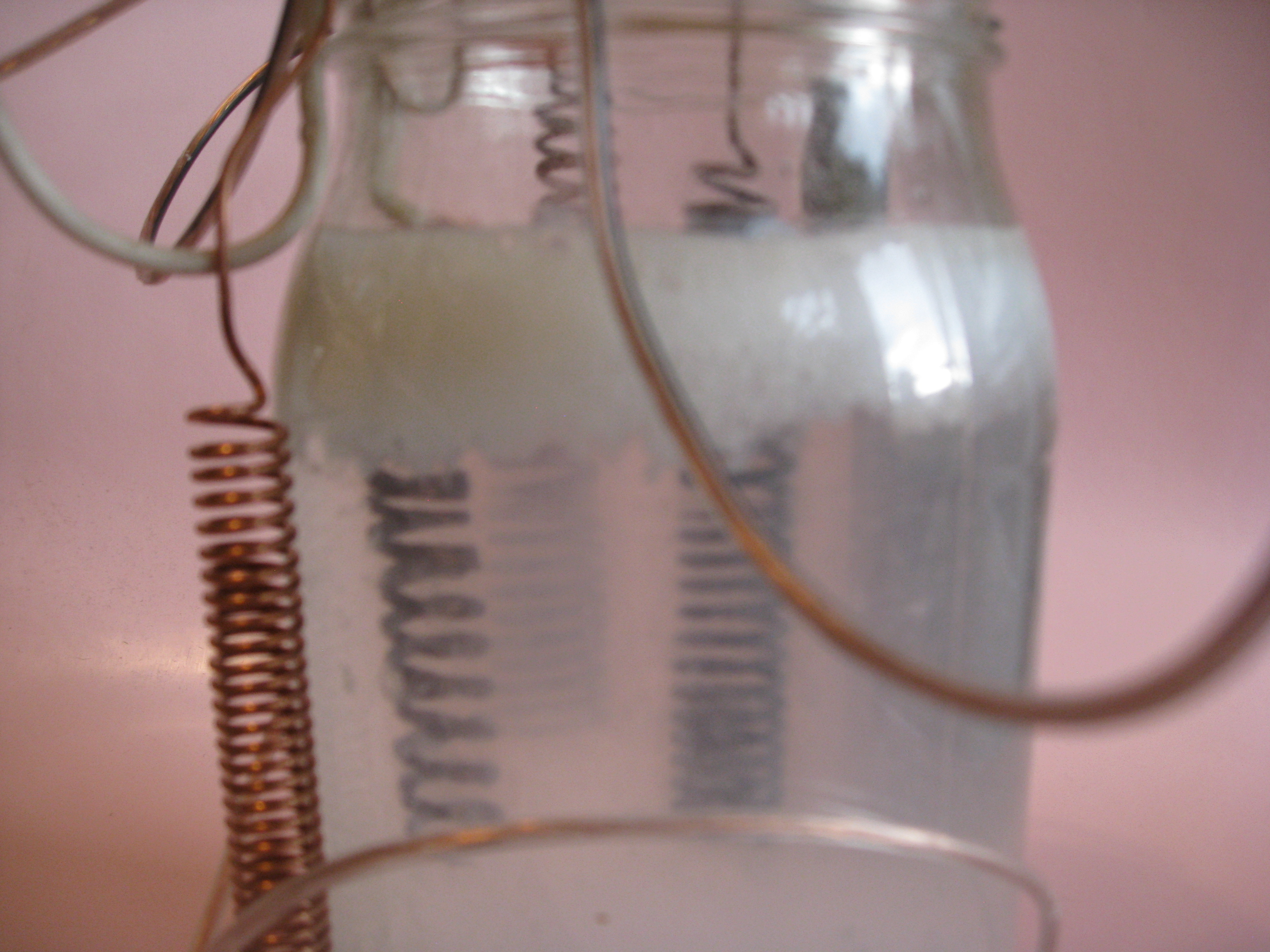 Wiev from top, 4 electrodes inside salt water solution, two nano coated copper spirals (katode) + one zink anode + one copper anode