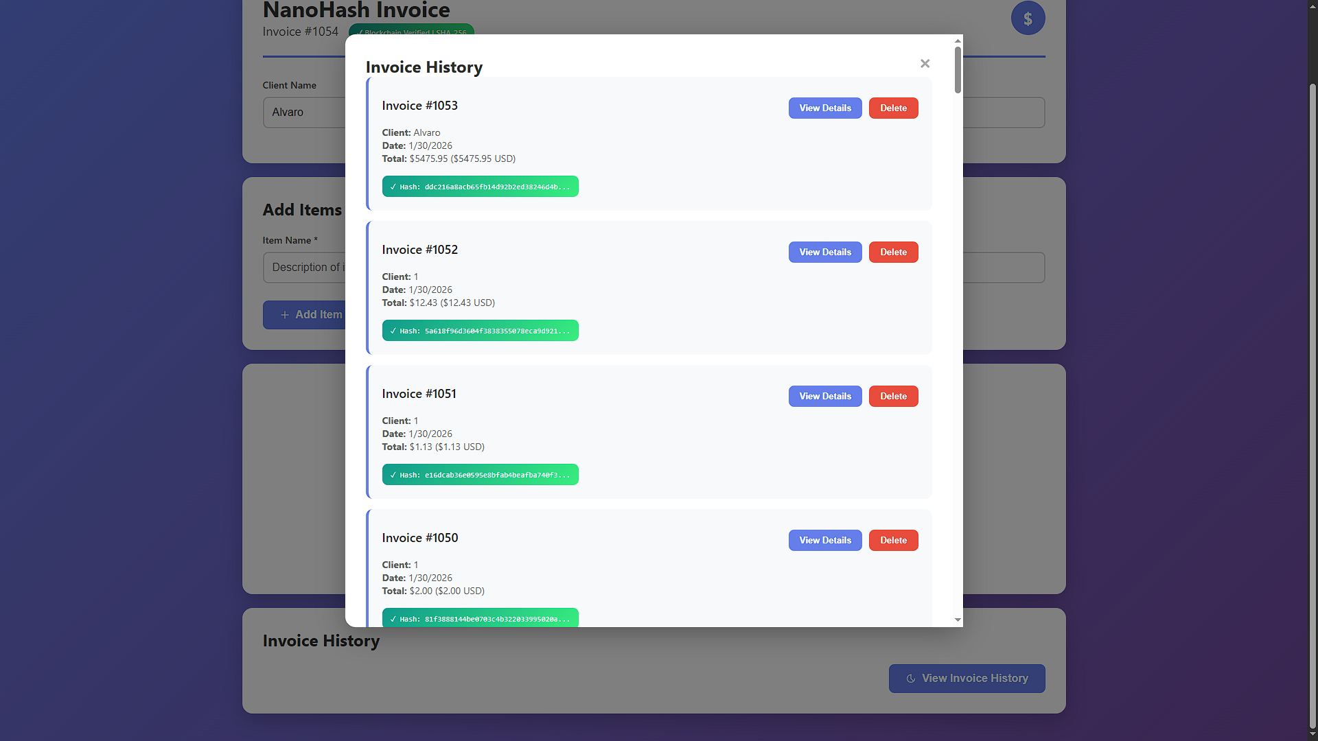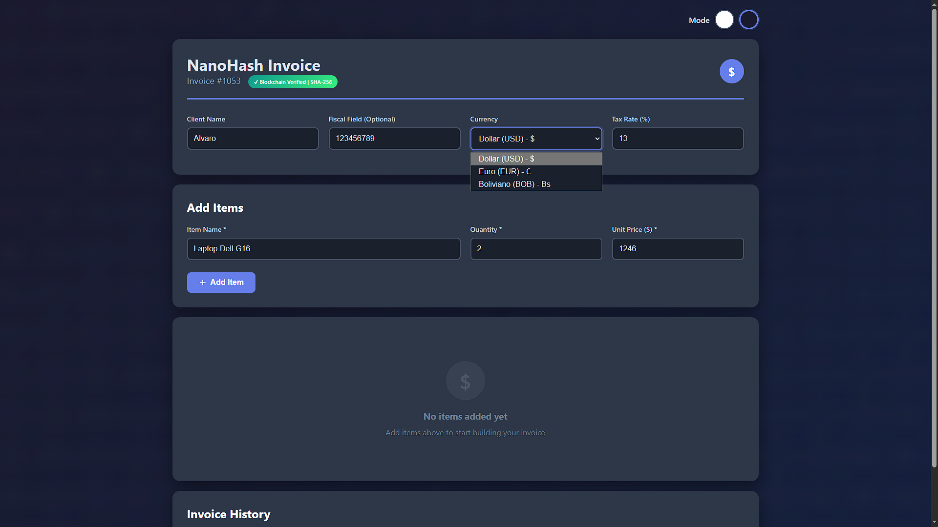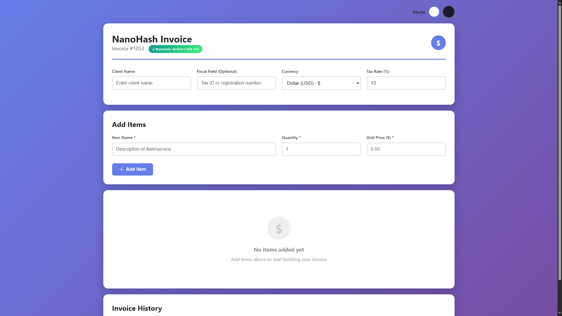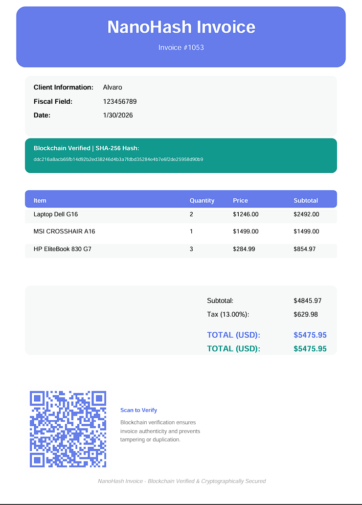 NanoHash Invoice was inspired by the idea that a modern invoice system should be simple, lightweight, fast, and intuitive, while still being complete and secure.