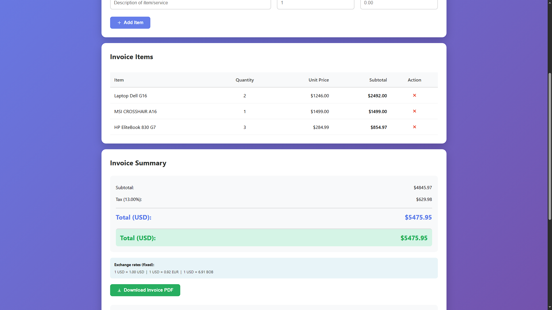 - Data storage: LocalStorage keeps invoice history, currency selection, and configuration without a backend