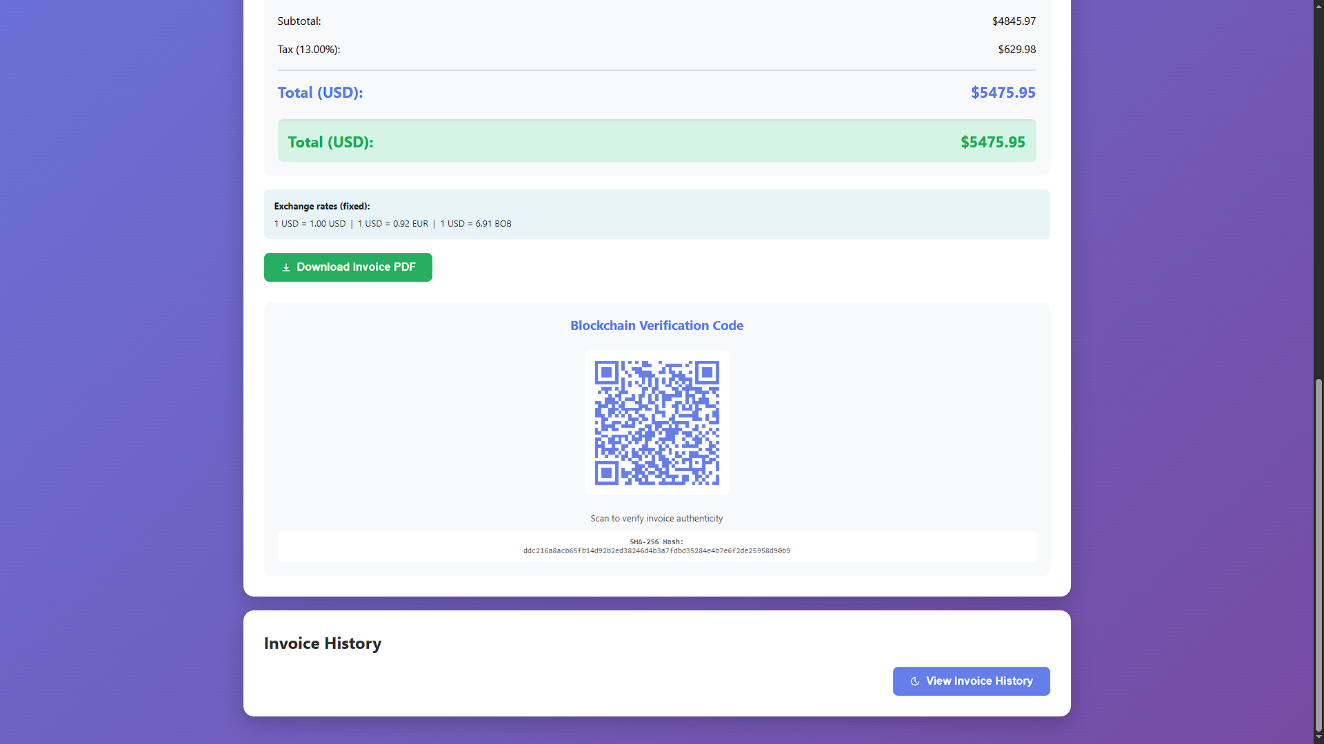 $$ \text{Hash} = \text{SHA-256}(\text{Invoice Data}) $$ - PDF export: jsPDF generates professional invoices