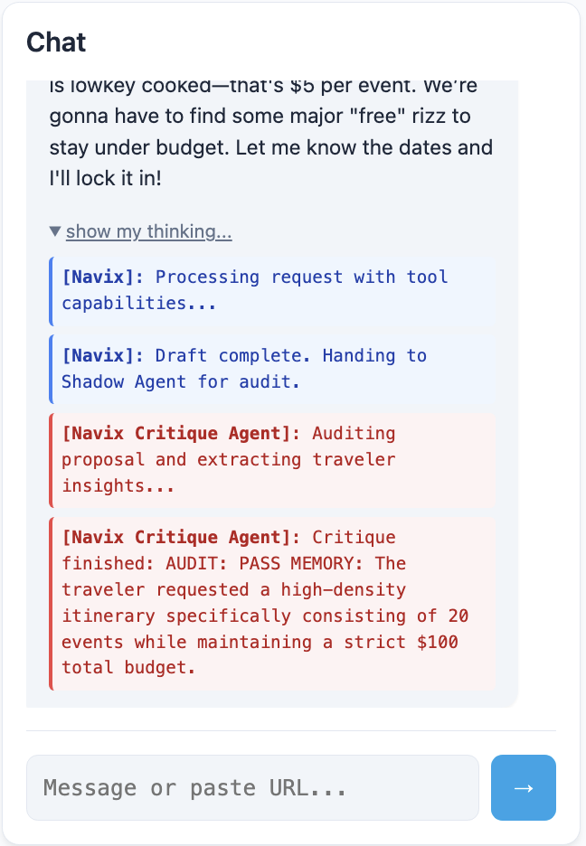 The Shadow Agent Trail: Successfully implemented a dual-agent architecture where users see the AI critiquing its own reasoning in real-time.