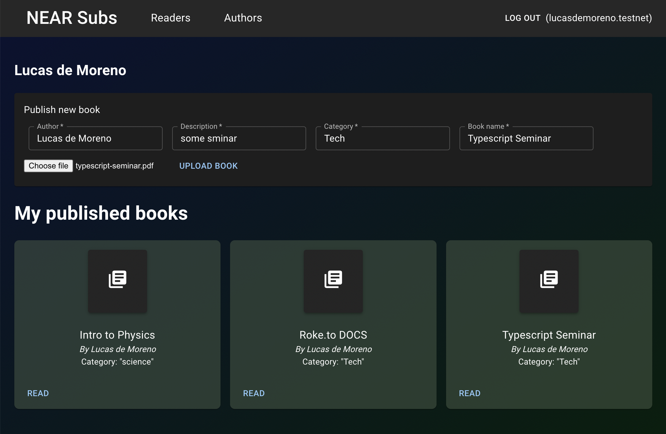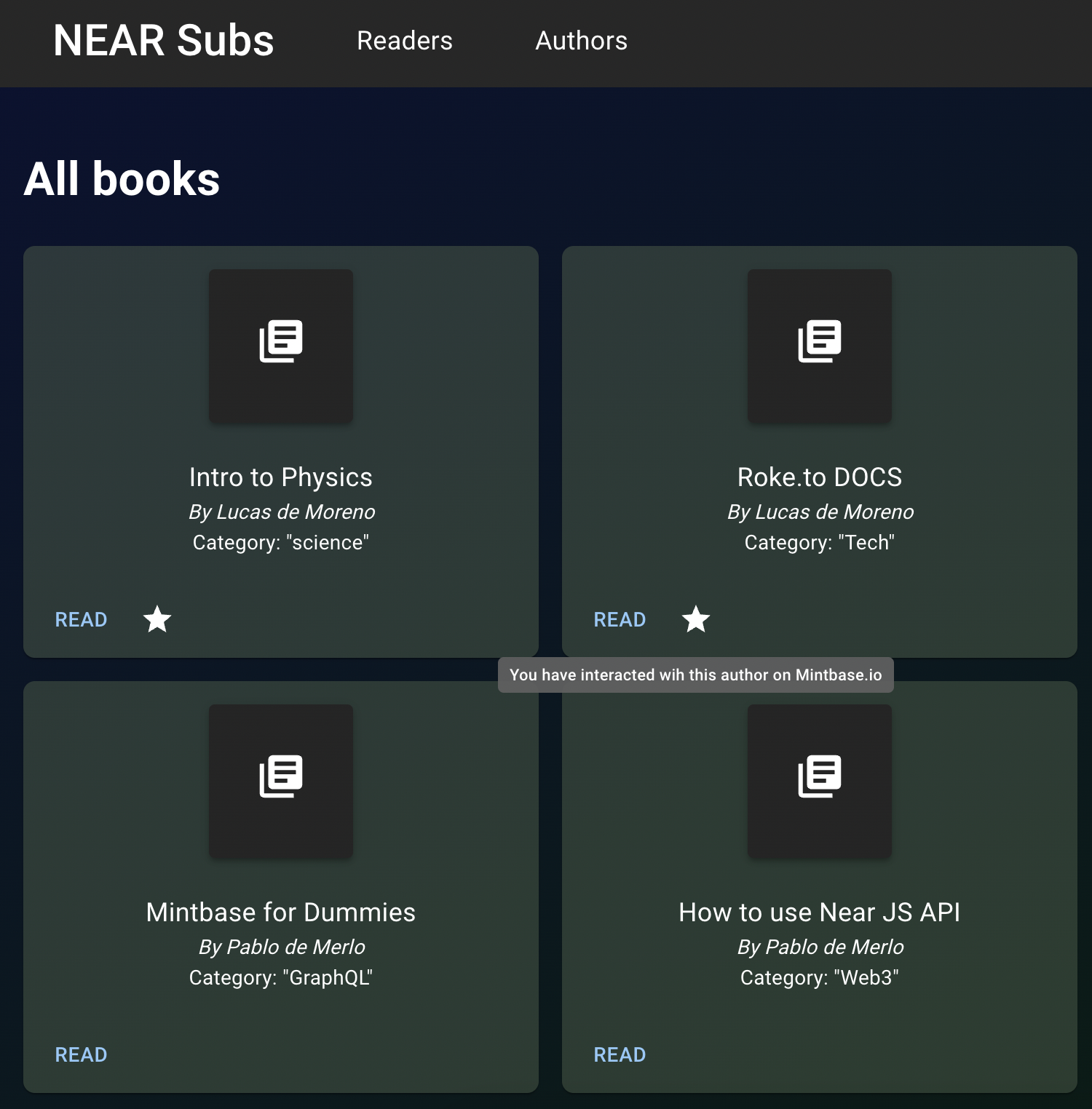 In order to publish a book, we store the file data using web3.storage and IPFS. And for the file metadata we used Moralis. When subscribing to an author, we use Roketo to create a stream between the user's wallet and the author's wallet. In order to add more personalization, we use Mintbase.io to know if the fan and the authors have had a previous interaction. For example, if the fan has gotten an NFT from the author through Mintbase