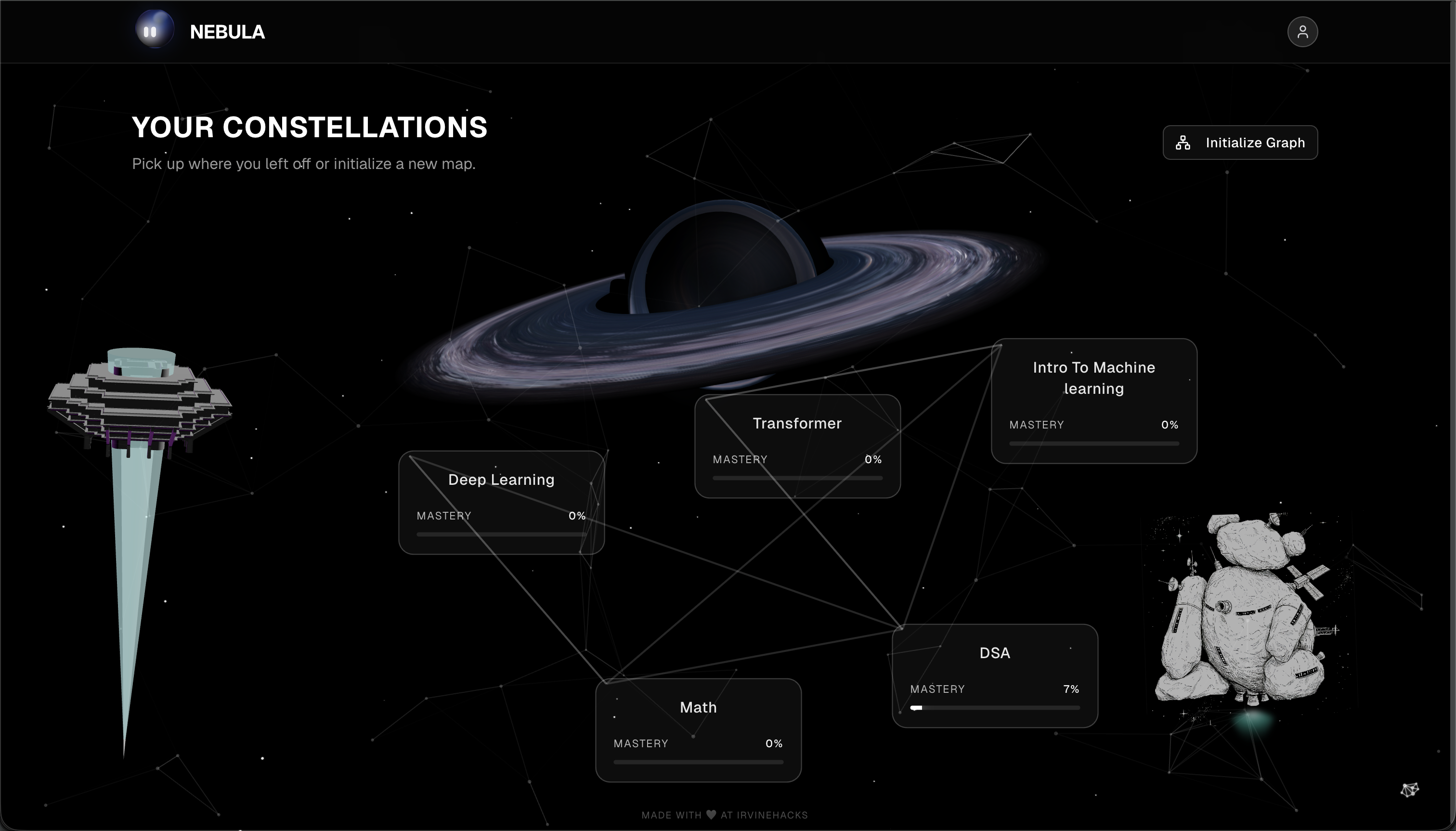 We built Nebula as a Chrome extension plus a knowledge-graph backend. In the extension, you highlight any practice question on the web (e.g. OpenStax); a button opens a small overlay where you type your answer. We send that to Gemini (cloud) for grading and get back a concept tag, score, and hint, then show a results card (concept pill, score bar, hint). We also use Gemini Nano (Chrome’s on-device model) to classify the page you’re on—so when you’re reading an OpenStax section or quiz, it maps the visible content to a concept in our graph and the sidebar shows the right node without a round-trip to the cloud. If you’re logged in, we sync the result to our kg-mastery app: we update mastery and store the solved problem. The kg-mastery stack is FastAPI + SQLite for courses and a concept graph; the frontend uses React and D3 to show the graph.