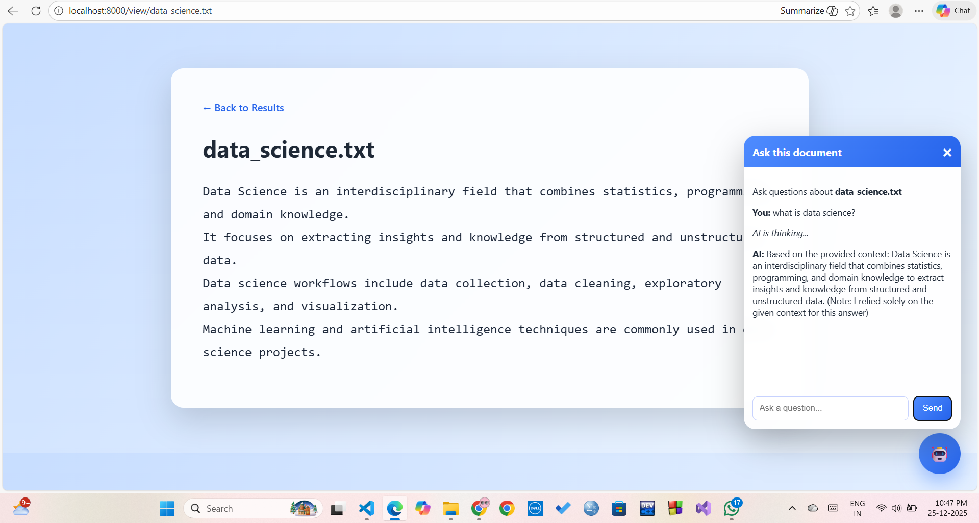 While studying and working on technical subjects, I noticed that students and researchers often store information across multiple documents but struggle to quickly find relevant context or clear explanations. Traditional keyword search only points to files, and generic AI chatbots often give answers without grounding them in the actual document content.