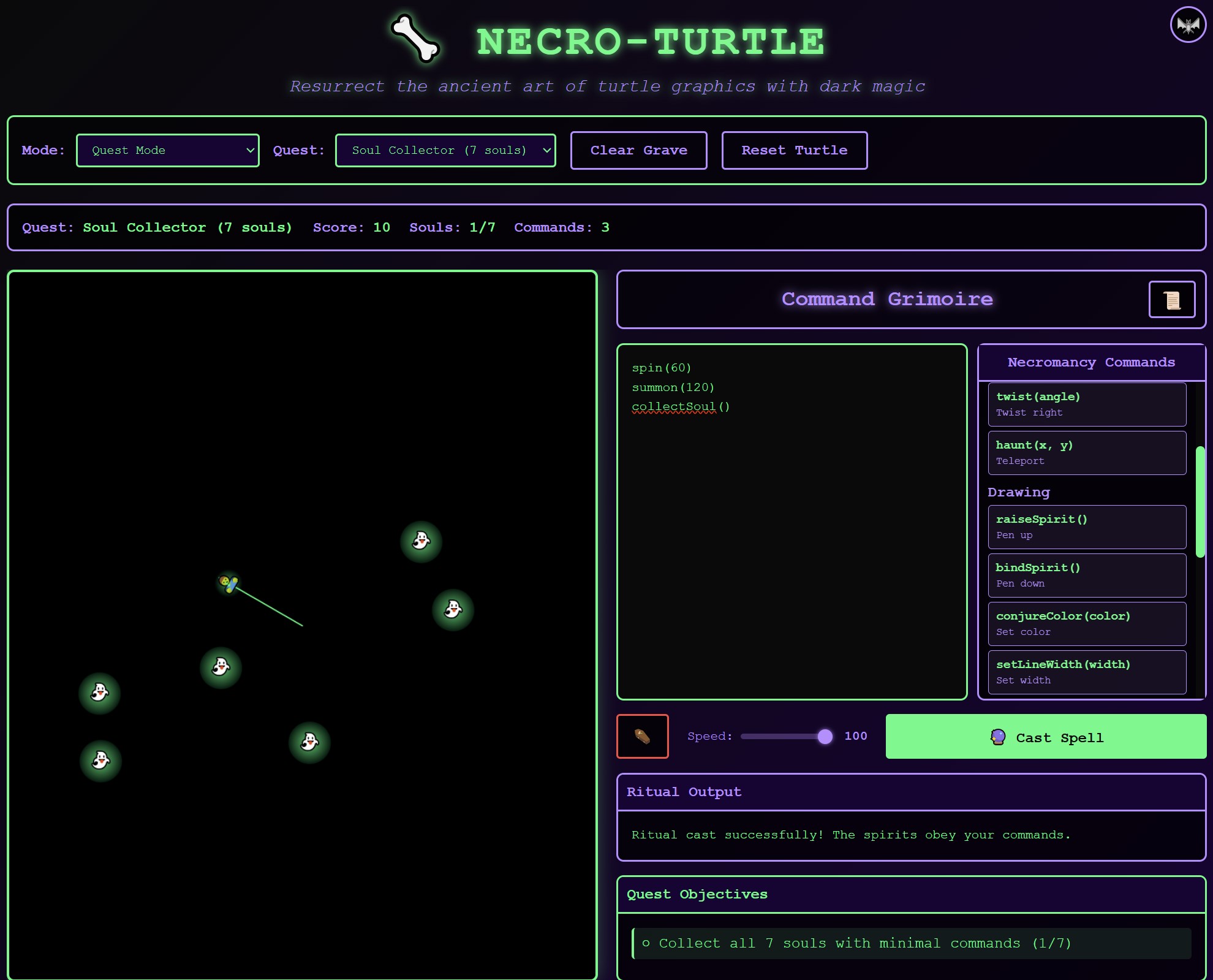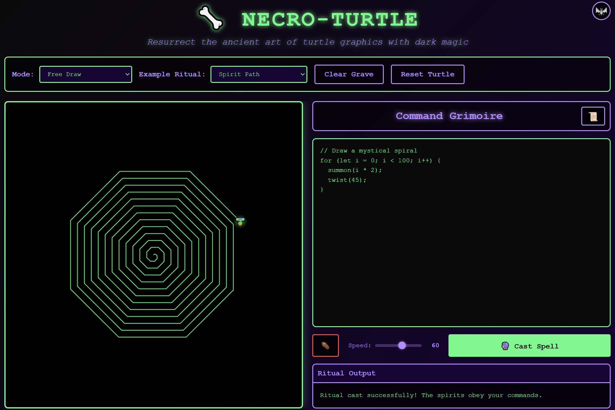 Necro-Turtle is a web-based game where you control a turtle familiar using a spooky DSL (Domain-Specific Language). By writing necromantic commands, you draw ritual sigils on a canvas. If the sigil forms a closed shape, it gathers magical energy — energy that can be used to raise zombies, cast rituals, and defend against threats.
