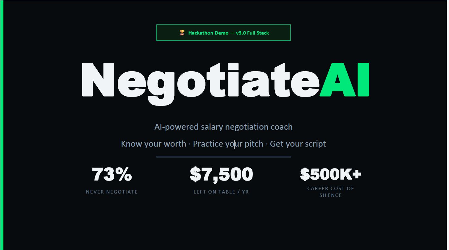 Did you know that during their lifetime, the average person leaves $1M on the table simply because they don't negotiate? With over 50% of U.S. workers failing to negotiate their starting salary, many leave significant money on the table. That is exactly why we built NegotiateAI, a full-stack, AI-powered salary negotiation coach designed to help candidates know their worth, practice their pitch, and generate a customized negotiation script.