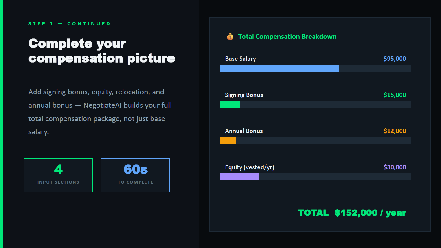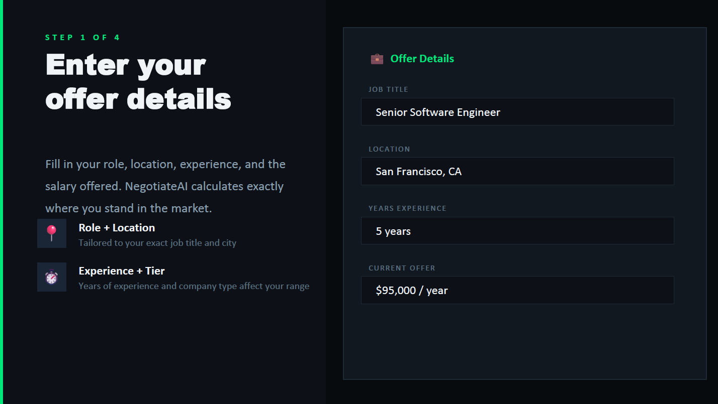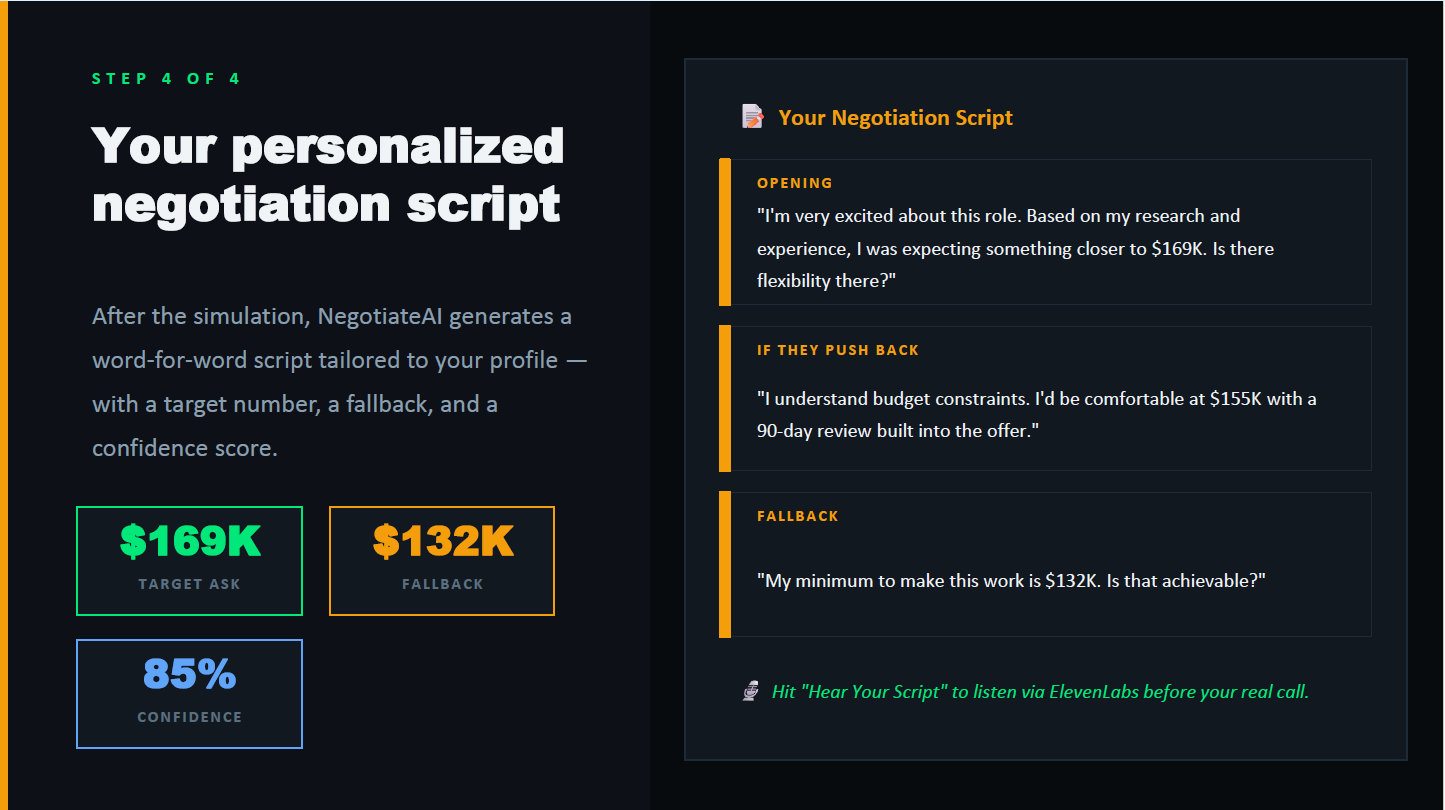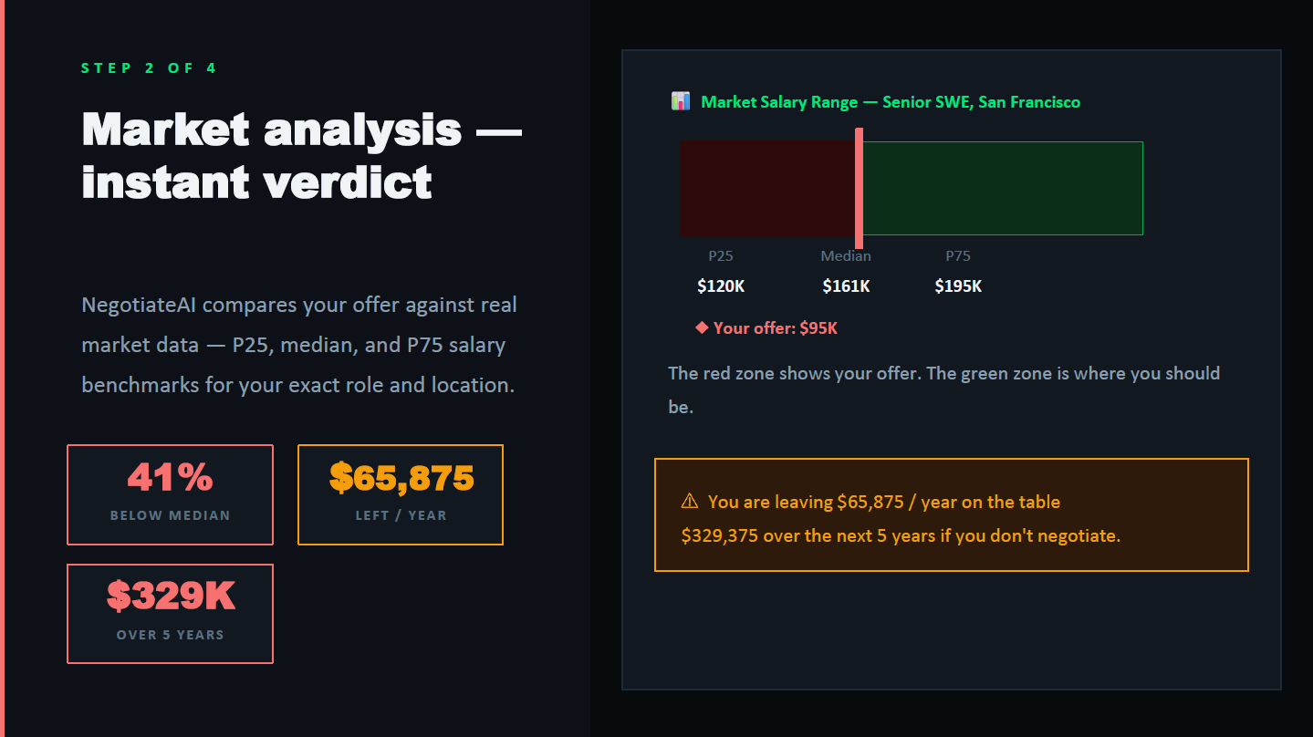 We developed a comprehensive four-step platform consisting of Profile Input, Market Analysis, a Live Negotiation Simulation, and a personalized Script Generator. Users input their offer details and background, and our system compares them against market data, adjusting for location and company tier, to show exactly how much money they might be leaving on the table. Then, they enter a live, multi-turn negotiation simulation where they practice bargaining against an AI hiring manager, receiving real-time tactical coaching on every single message they send. Finally, the system reviews the practice transcript to generate a customized, word-for-word negotiation script with specific opening statements, target numbers, and fallback pivots.