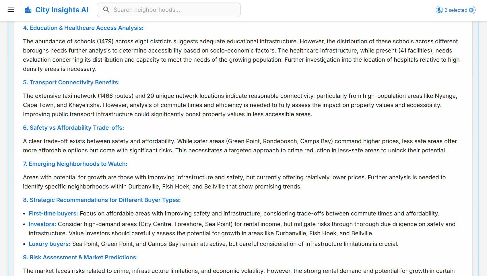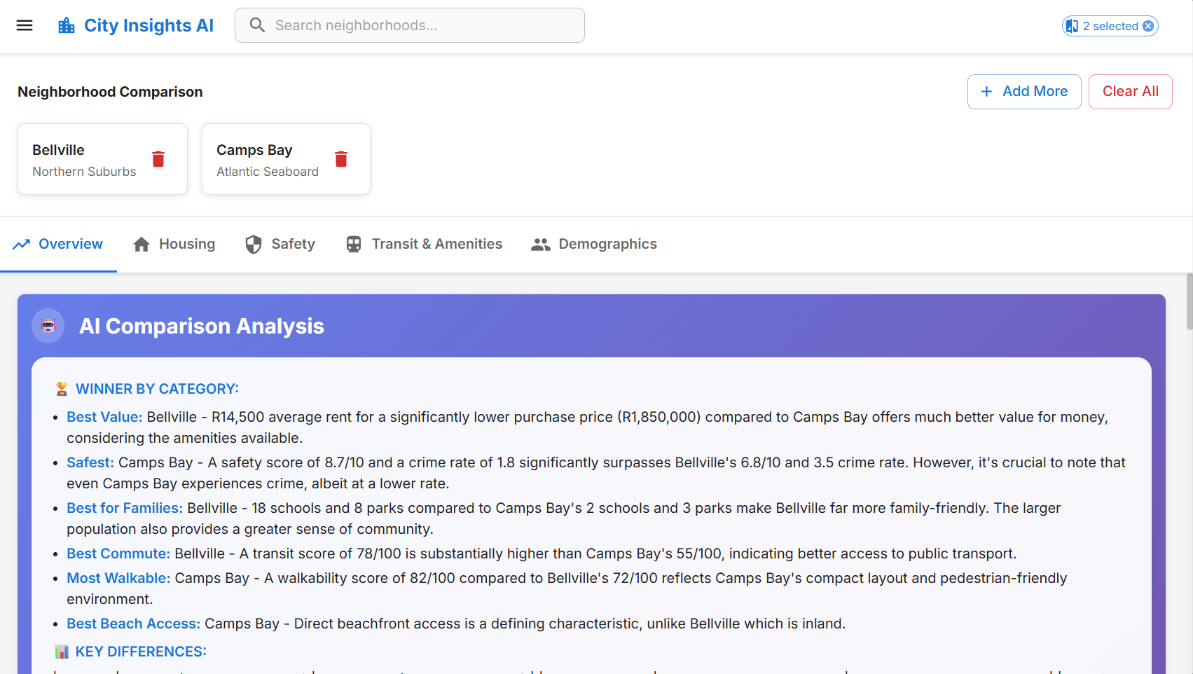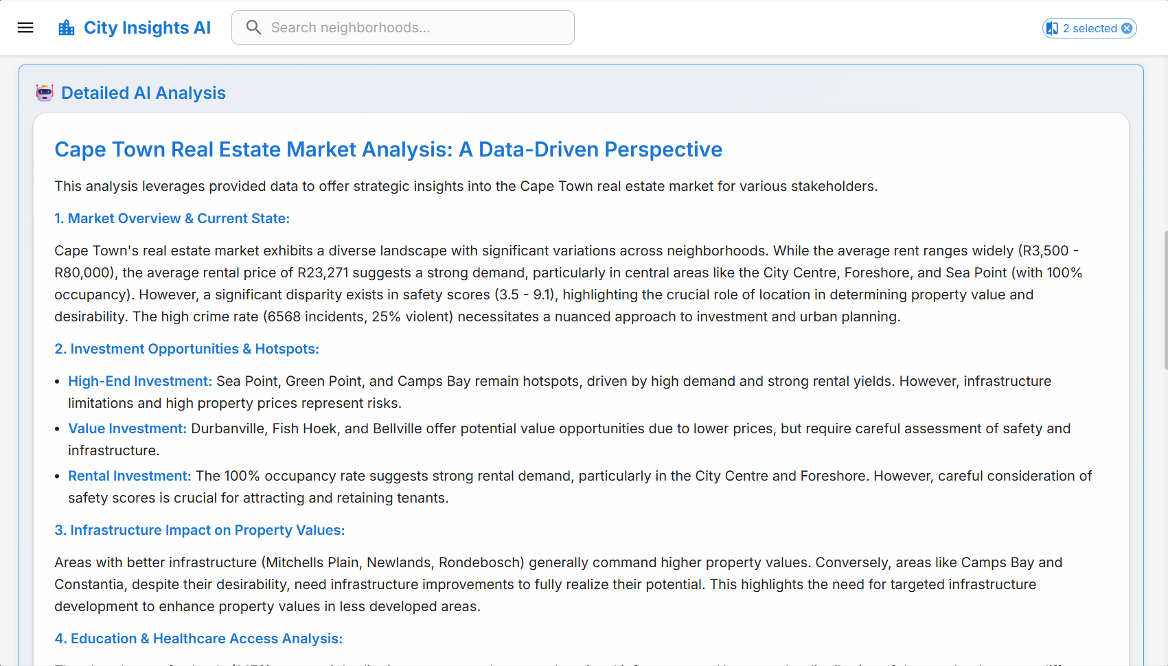 I was inspired to create Cape Town Insights after recognizing that scattered urban data - crime statistics, school locations, transport routes, healthcare facilities - could be unified through AI to provide comprehensive neighborhood intelligence.