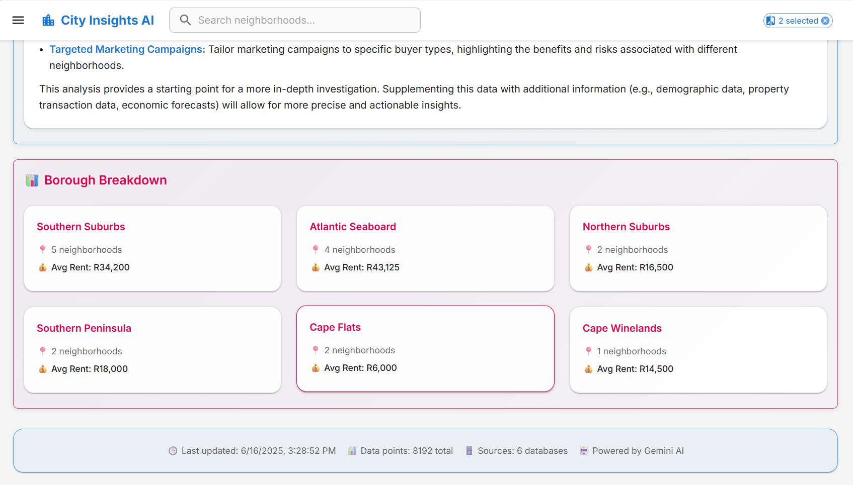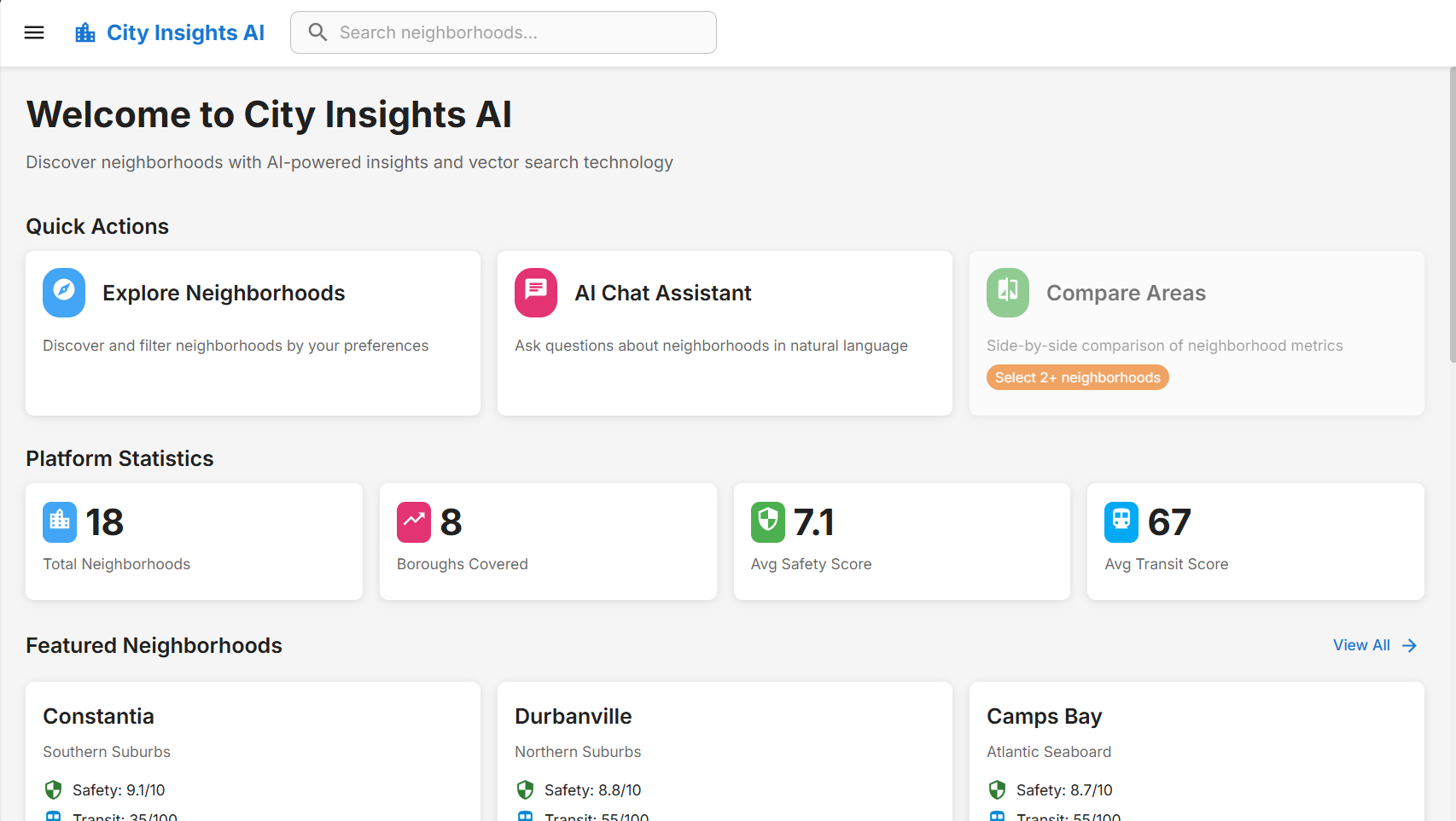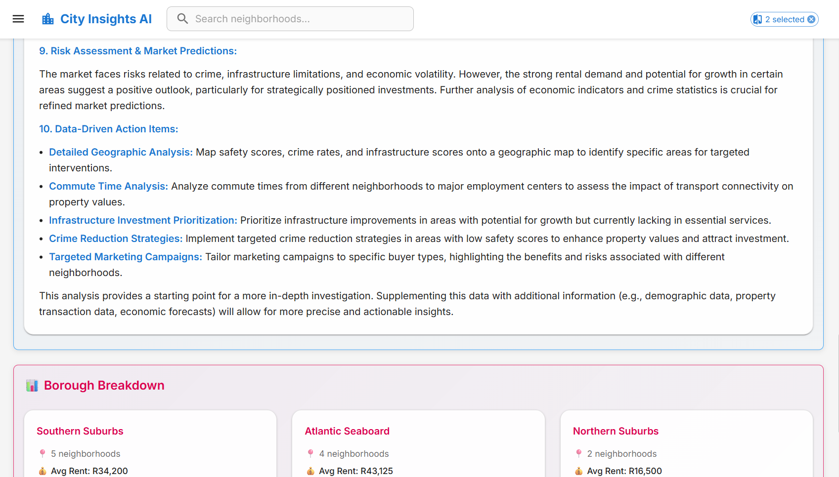 I was inspired to create Cape Town Insights after recognizing that scattered urban data - crime statistics, school locations, transport routes, healthcare facilities - could be unified through AI to provide comprehensive neighborhood intelligence.