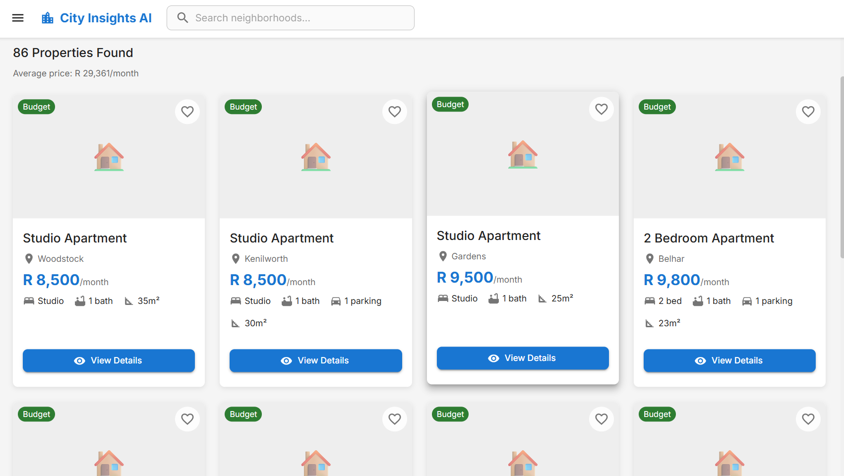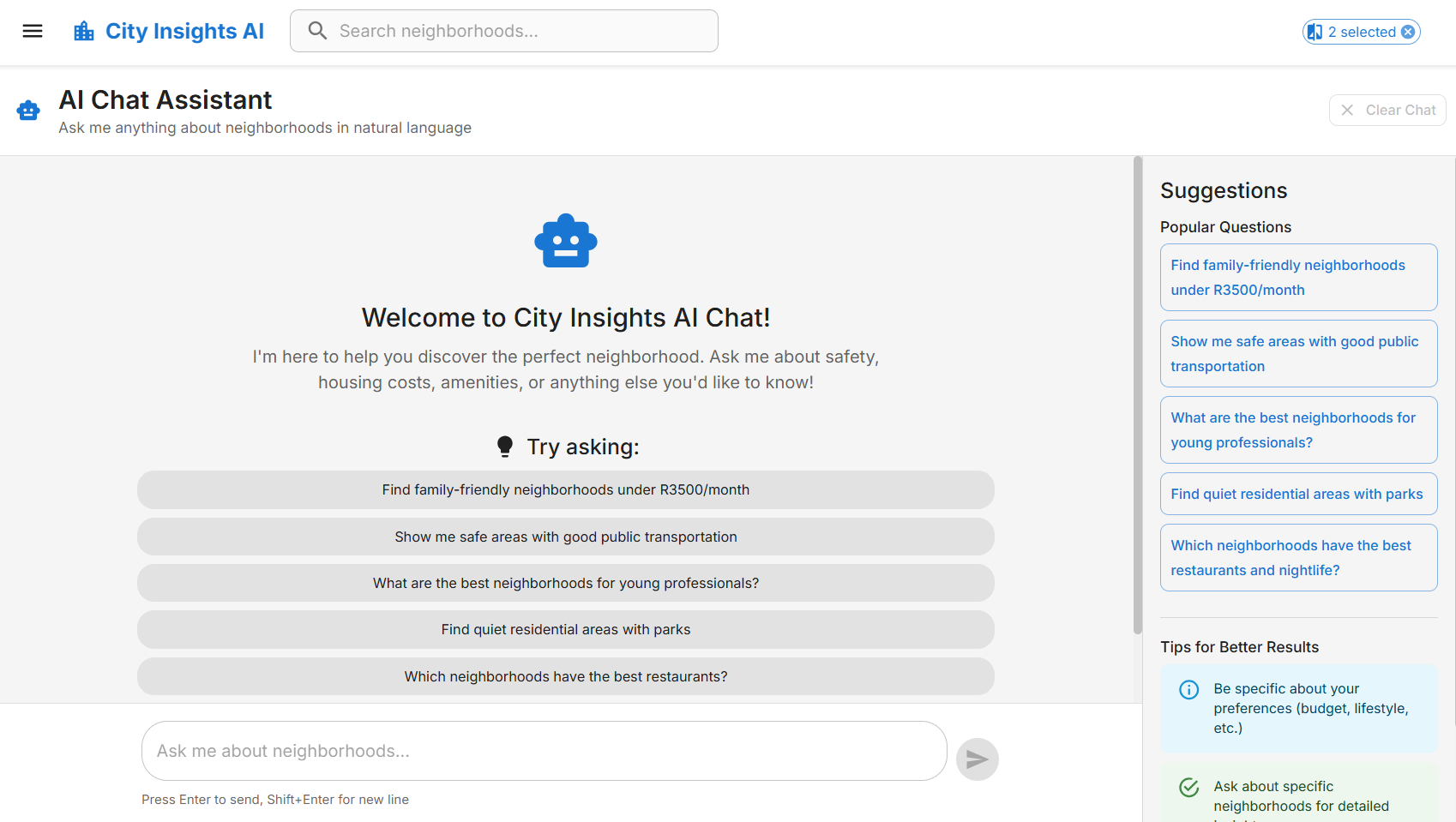 - AI-Powered Chat: Natural language queries like "Find safe, family-friendly areas under R25,000 with good schools"