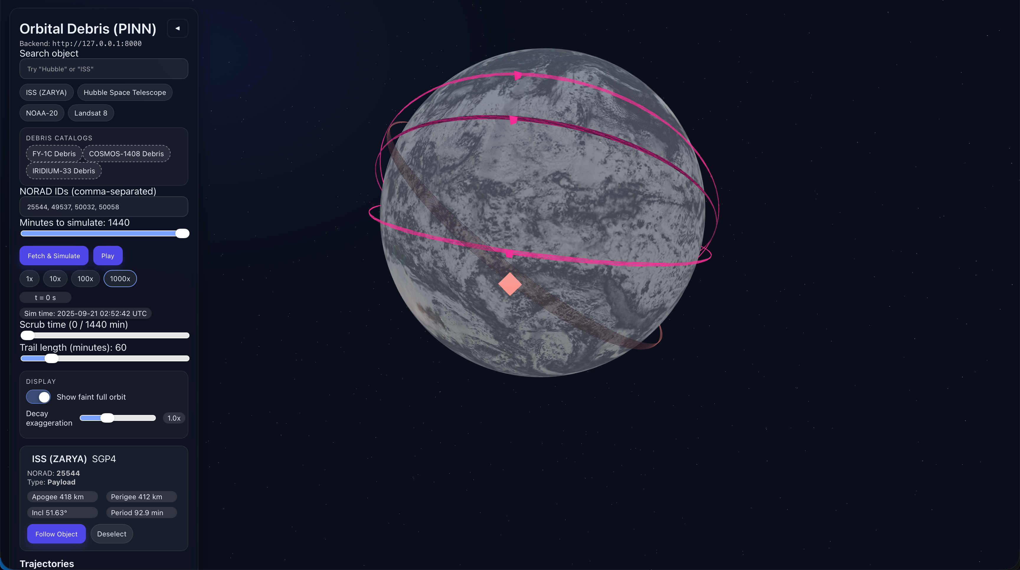 We built a working pipeline from public data to physics and ML to a clean 3D view. The PINN improves the trajectory slightly while still following the rules of orbital motion, and it fits neatly into our API. The UI looks good and feels smooth with trails, playback, a follow camera, and easy debris loading so people can explore real cases.