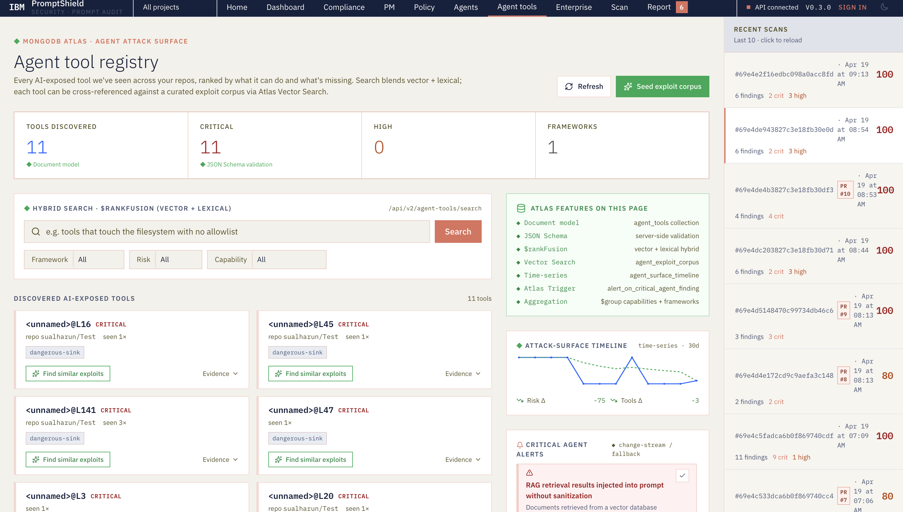 Mostly that the full chain works end-to-end. A pull request that adds something like @tool def run_shell(cmd): subprocess.run(cmd, shell=True) comes back as a critical TOOL_PARAM_TO_SHELL finding — CWE-78, OWASP LLM06, a dataflow trace, and a Gemini-generated fix, all on the PR itself. Behind it, a single scan lights up five Atlas surfaces at once: scan in, change-stream trigger writes an alert, tool registry updates, time-series point lands, and the vector embedding refreshes for hybrid search.