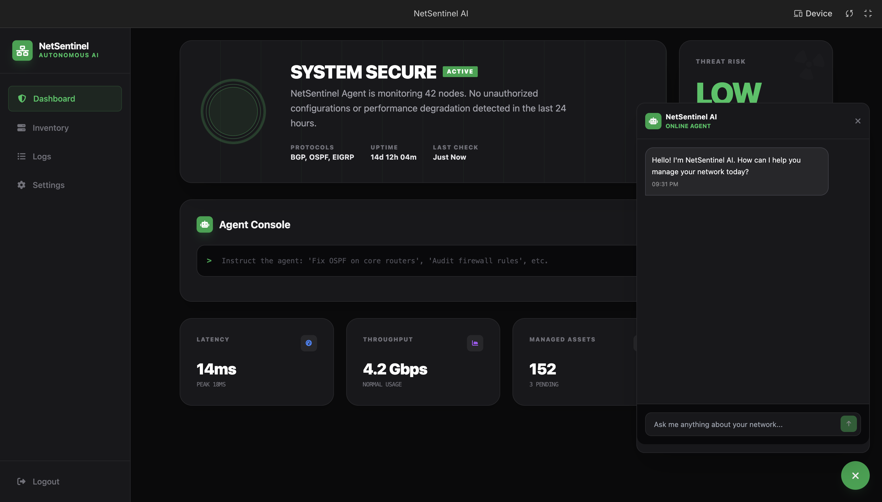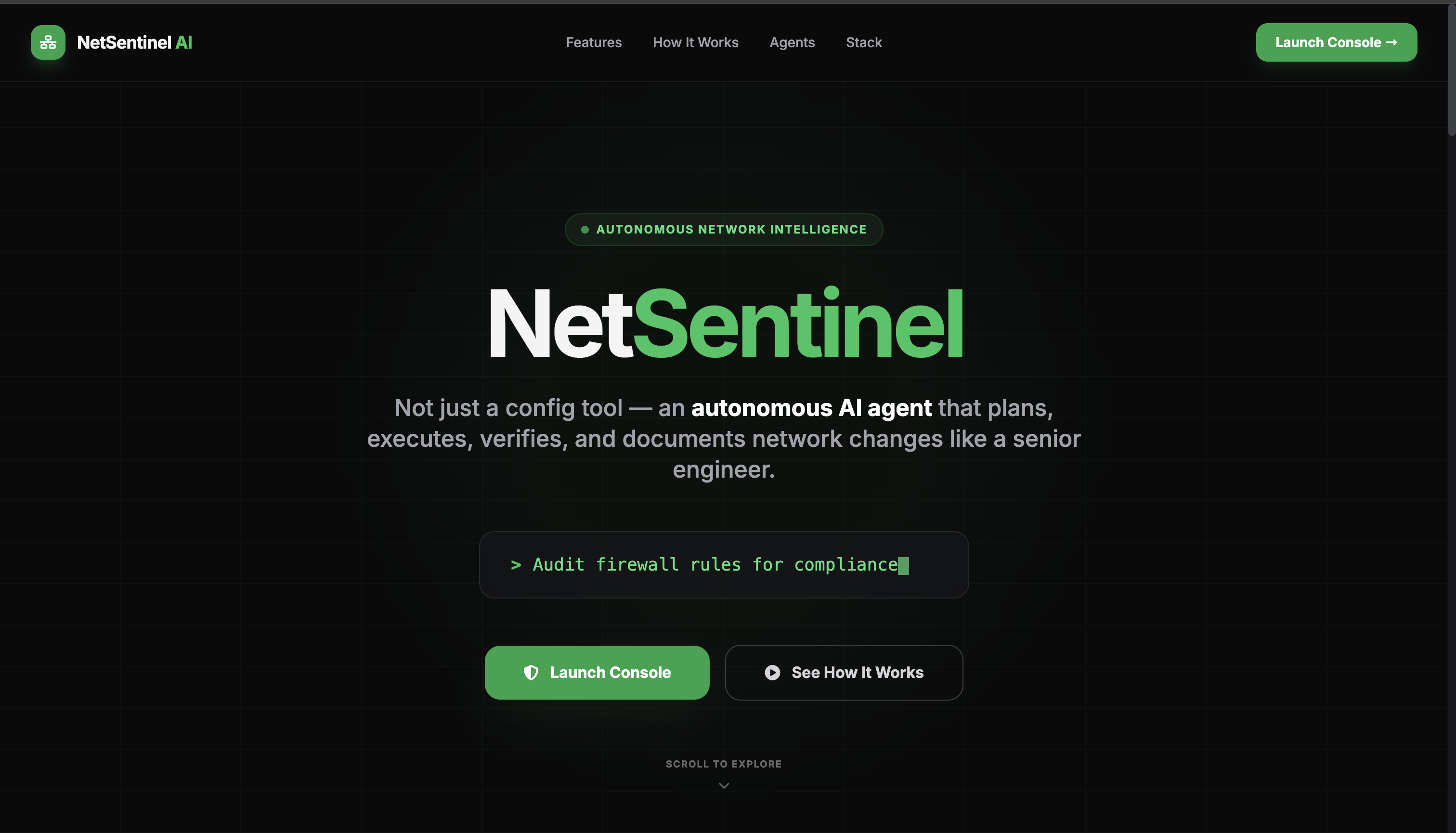 Our inspiration for creating Net-sentinel came from realizing that very few AI tools truly support network engineers in their day‑to‑day tasks, and even fewer can help regular users who just need guidance with routing or connectivity issues. We set out to build a smart helper that understands what someone wants, figures out the steps required, performs the work safely, checks that everything is functioning correctly, and always keeps a human in the loop. To achieve this, we combined an AI agent capable of interpreting natural‑language requests with a set of specialized tools that execute tasks and report results back through a simple dashboard interface. Along the way, we faced challenges such as designing safe automation guardrails, handling vague or incomplete instructions, and balancing a clean UI with the technical depth network engineers expect. Despite these hurdles, we’re proud that Net-sentinel can already break down real networking tasks, execute multi‑step workflows, and validate changes to prevent misconfigurations. Building this system taught us how powerful AI becomes when paired with thoughtful UX, strong safety boundaries, and clear human oversight. Looking ahead, we plan to expand the toolset, integrate with more vendors and cloud platforms, enhance the agent’s reasoning for complex workflows, and introduce collaborative features so teams can review and approve changes together