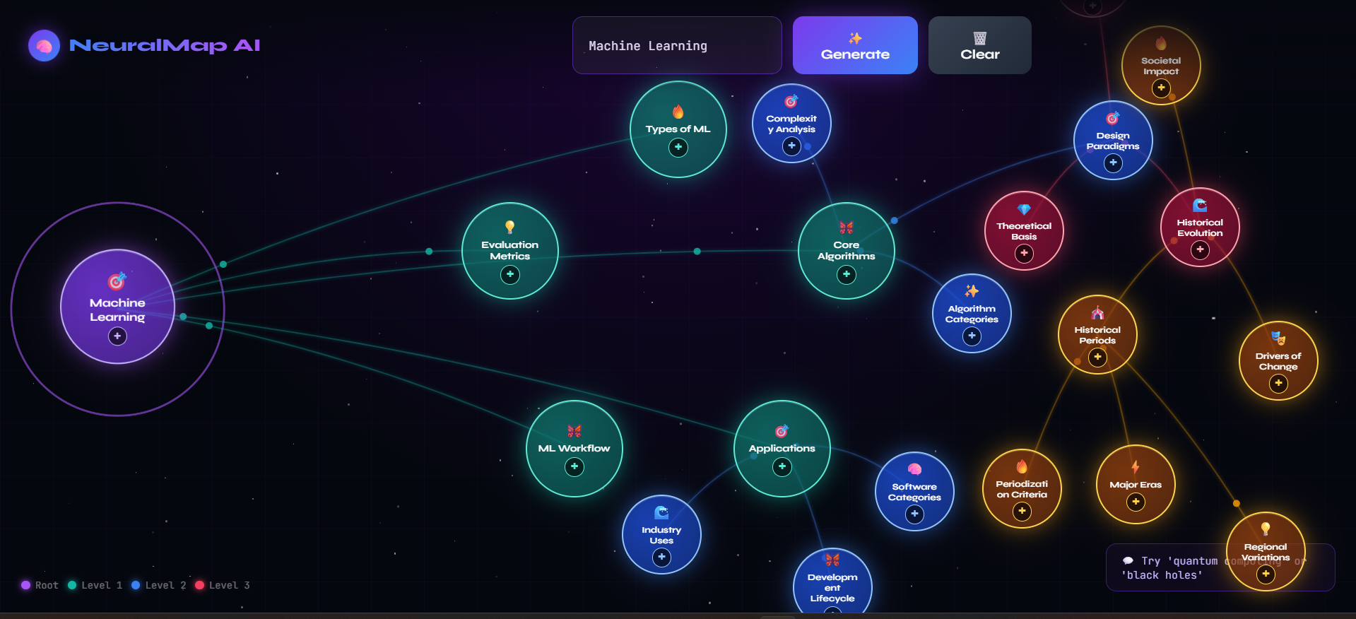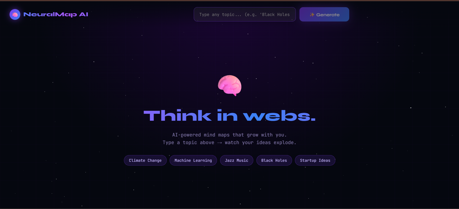 The idea behind NeuralMap AI was to create an intelligent tool where users can input any topic and instantly see it unfold into a dynamic network of ideas. Instead of searching and scrolling, users can explore knowledge visually and interactively.