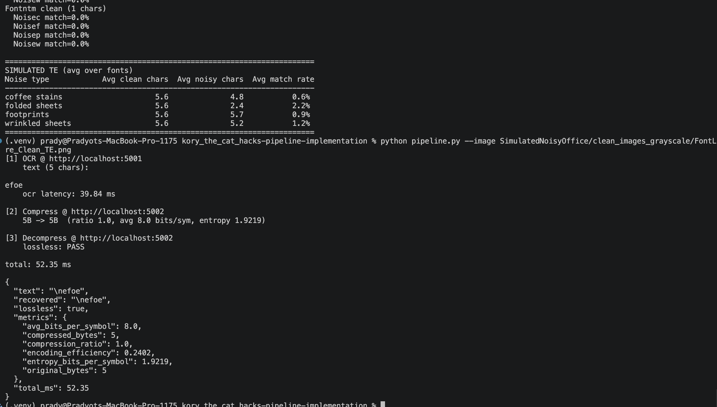 A two-stage pipeline that ingests a noisy scanned document image, extracts its text using a convolutional neural network (CNN), and compresses the output using adaptive Huffman encoding, delivered as two communicating microservices.